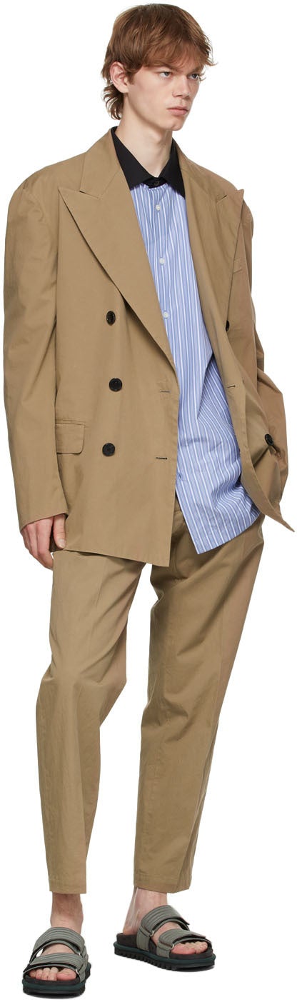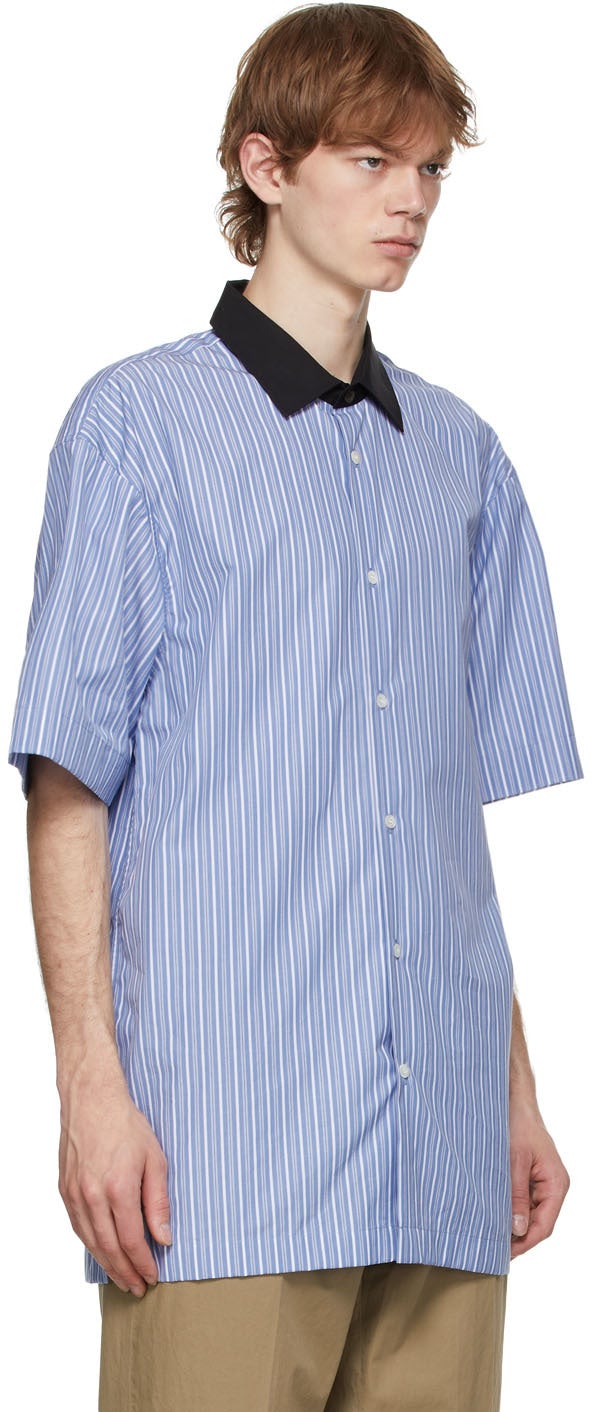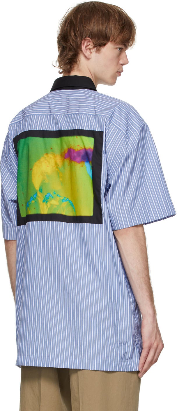 Short sleeve cotton poplin shirt in blue featuring stripes in white throughout. Spread collar in black. Button closure at front. Graphic patch in multicolor at back. Vented side-seams. Part of the Dries Van Noten x Len Lye collaboration. Supplier color: Light blue 100% cotton. Brand: Dries Van Noten