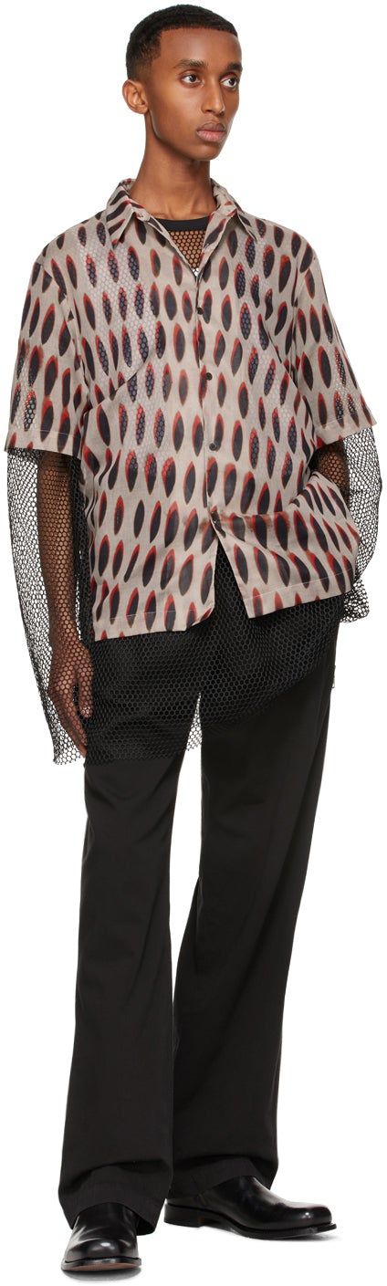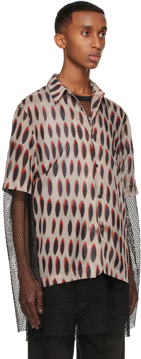 Short sleeve semi-sheer plain-woven cotton shirt in grey. Graphic pattern printed in tones of black and red throughout. Spread collar. Button closure at front. Part of the Dries Van Noten x Len Lye collaboration. Supplier color: Grey 100% cotton. Brand: Dries Van Noten