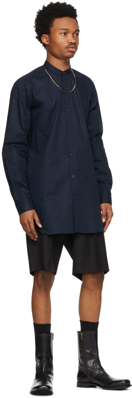Long sleeve cotton poplin shirt in navy. Band collar. Button closure at front. Three-button barrel cuffs. Shirttail hem. Tonal hardware. Supplier color: Midnight 100% cotton. Brand: Dries Van Noten