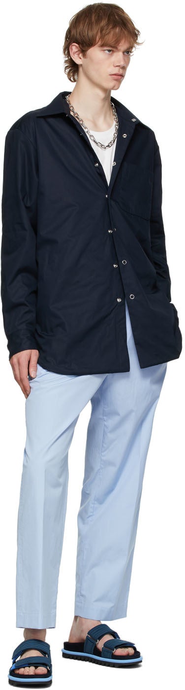 Long sleeve padded cotton poplin shirt in navy. Spread collar. Press-stud button closure at front. Patch pocket at chest. Barrel cuffs with press-stud fastening. Shirttail hem. Supplier color: Midnight 100% cotton. Brand: Dries Van Noten