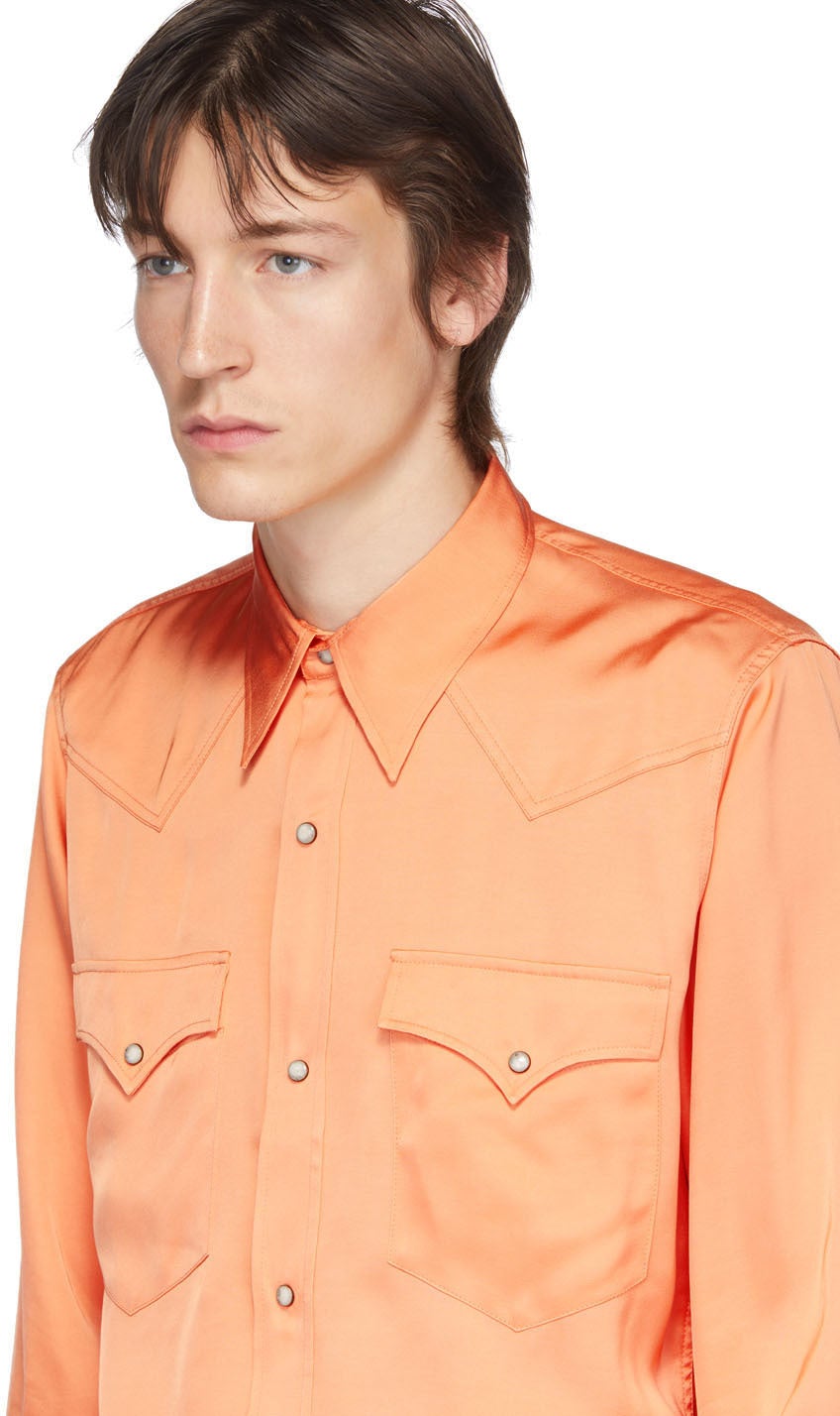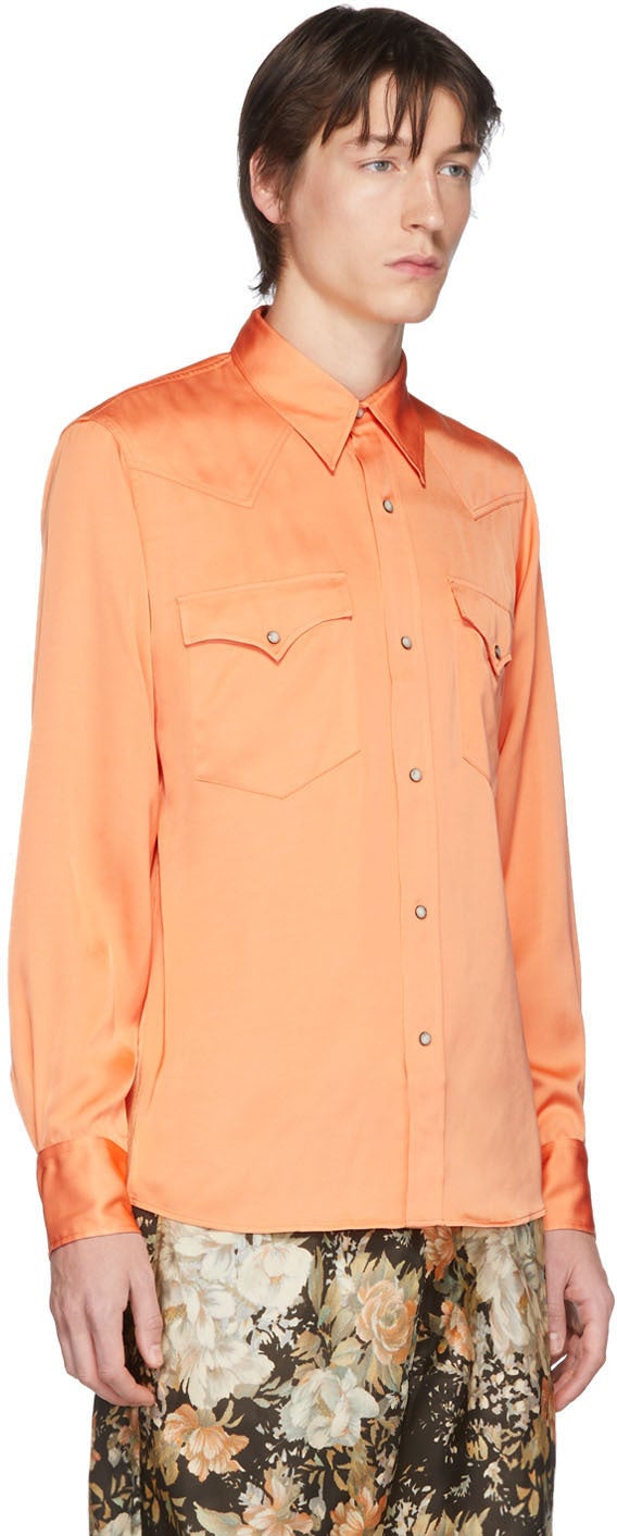 Long sleeve viscose satin shirt in orange. Spread collar. Press-stud closure at front. Press-stud flap pockets at chest. Two-button barrel cuffs. Drop-tail hem. Supplier color: Peach 100% viscose. Brand: Dries Van Noten