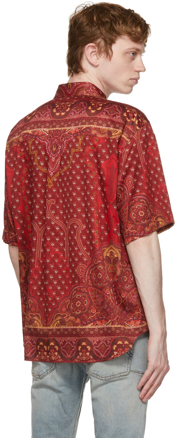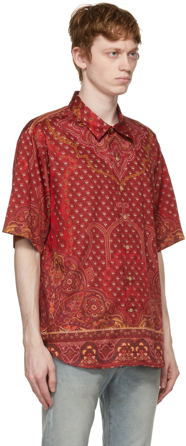 Short sleeve cotton poplin shirt featuring graphic patterns in tones of beige, red, and black. Spread collar. Button closure at front. Box pleat at back yoke. Shirttail hem. Logo-engraved white hardware. Supplier color: Bordeaux 100% cotton. Brand: Etro
