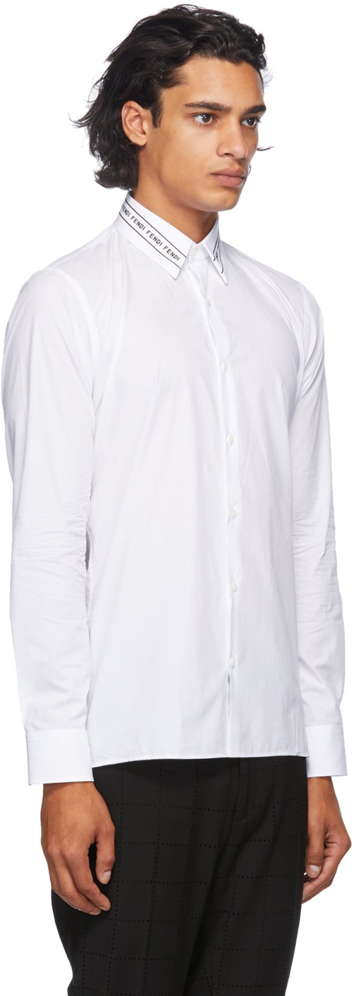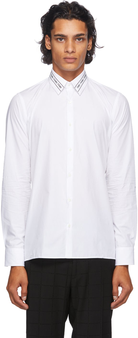 Long sleeve cotton poplin shirt in white. Logo and stripes embroidered in black at spread collar. Button closure at front. Single-button barrel cuffs. Vents at side seams. Tonal hardware. Supplier color: White 100% cotton. Brand: Fendi