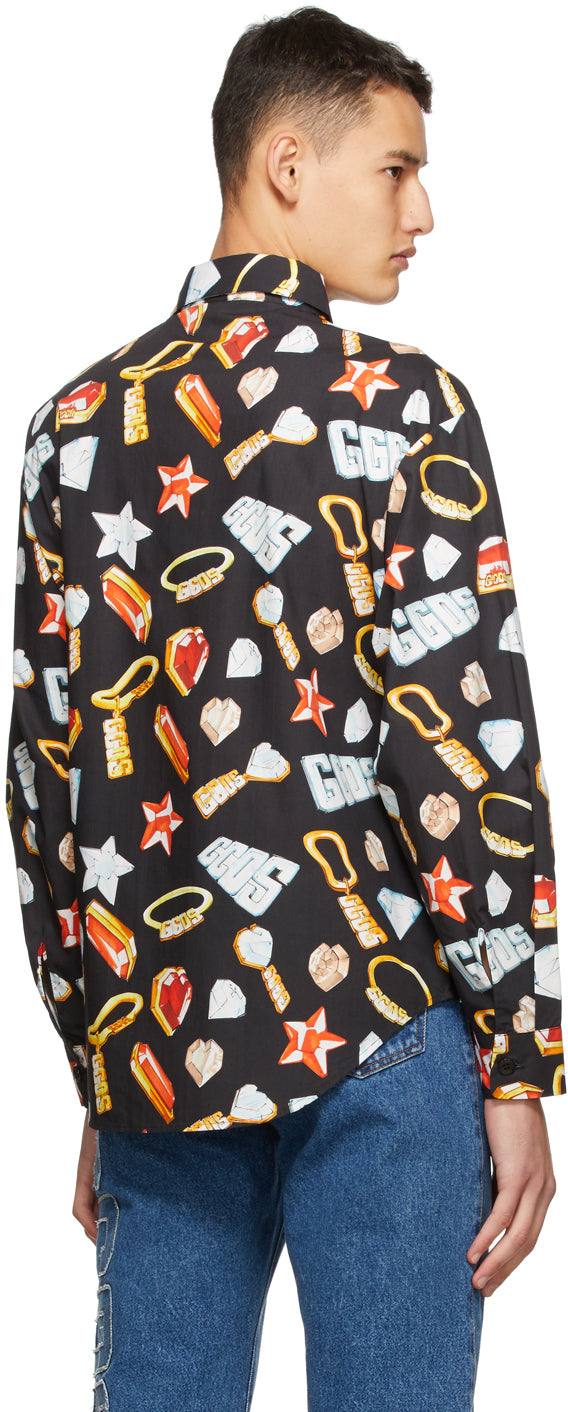 Long sleeve cotton poplin shirt in black. Multicolor logo graphic pattern printed throughout. Spread collar. Button closure at front. Pleat at single-button barrel cuffs. Shirttail hem. Supplier color: Black 100% cotton. Brand: GCDS