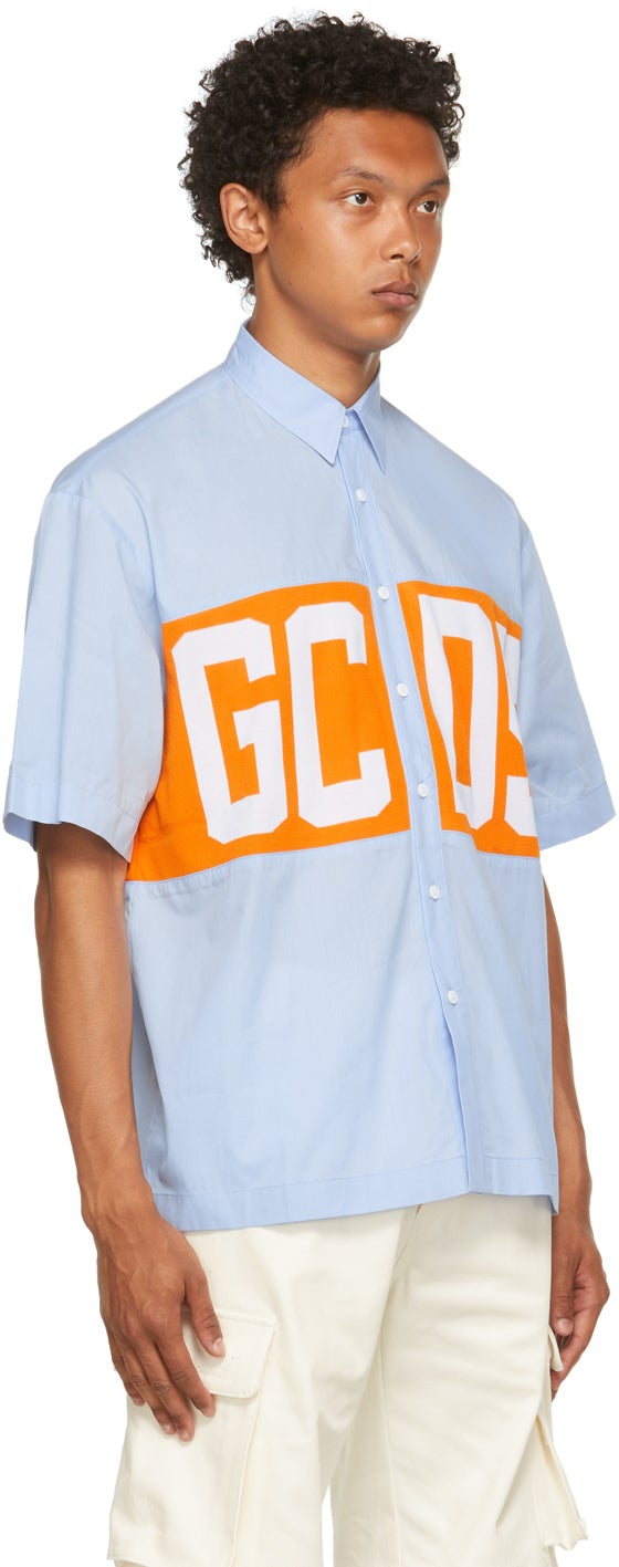 Short sleeve paneled cotton poplin shirt in blue. Spread collar. Button closure at front. Knit panel in orange featuring jacquard knit logo in white at front and back. Logo flag at side-seam. Vented side-seams. Logo-engraved white and silver-tone hardware. Supplier color: Light blue Body 1: 100% cotton. Body 2: 100% polyester. Brand: GCDS