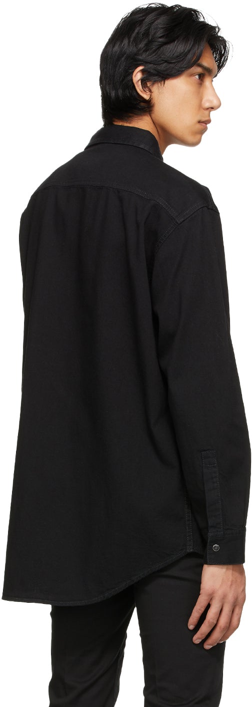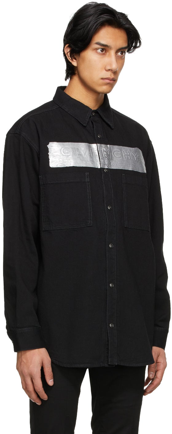 Long sleeve non-stretch denim shirt in black. Spread collar. Press-stud closure at front. Bonded trim and embossed logo appliqué in silver-tone at chest. Patch pockets at front. Silver-tone hardware featuring enamel fill in black. Supplier color: Black 100% cotton. Brand: Givenchy