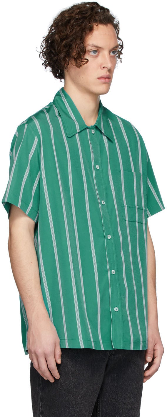 Short sleeve stretch rayon poplin shirt in green featuring stripes in white and black throughout. Spread collar. Button closure at front. Patch pocket at chest. Tonal textile graphic appliqué at back. Shirttail hem. Supplier color: Green 80% rayon, 20% elastane. Brand: Goodfight