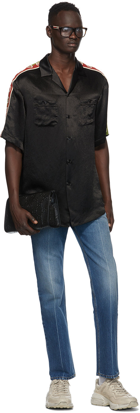 Short sleeve satin shirt in black. Open spread collar. Button closure at front. Buttoned patch pockets at chest. Jacquard knit jersey trim featuring logo and stripes in green, red, and white at shoulders and sleeves. Shirttail hem. Mother-of-pearl hardware. Supplier color: Black mix Body: 100% acetate. Trim: 100% polyamide. Brand: Gucci