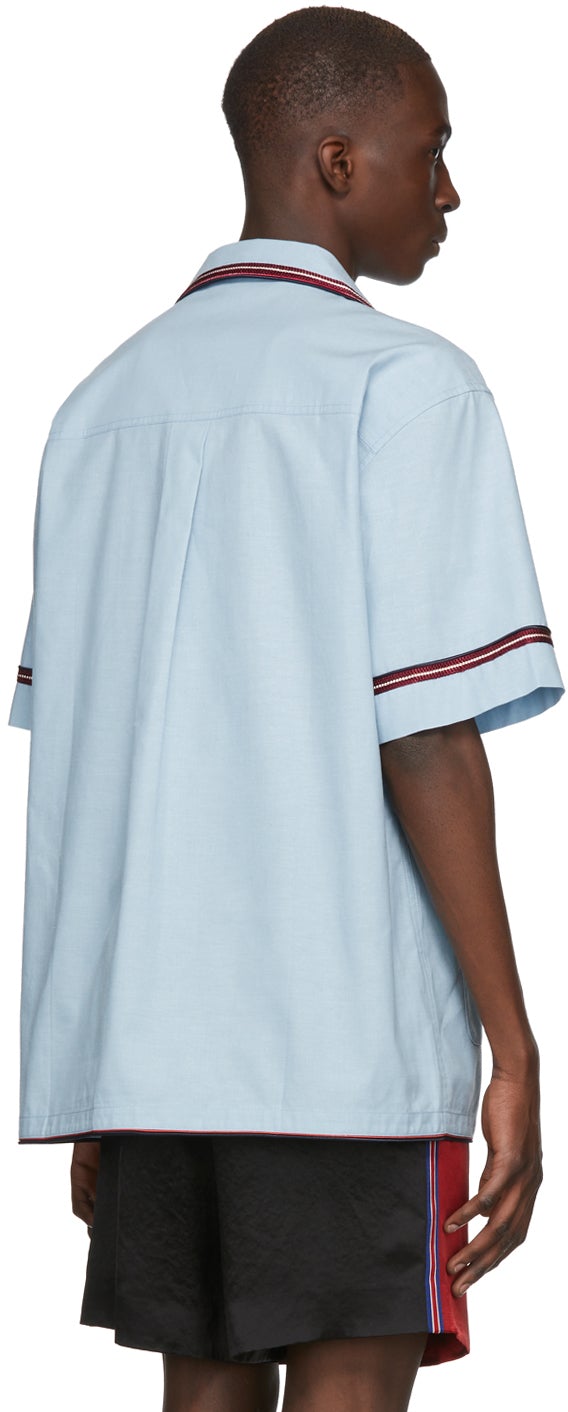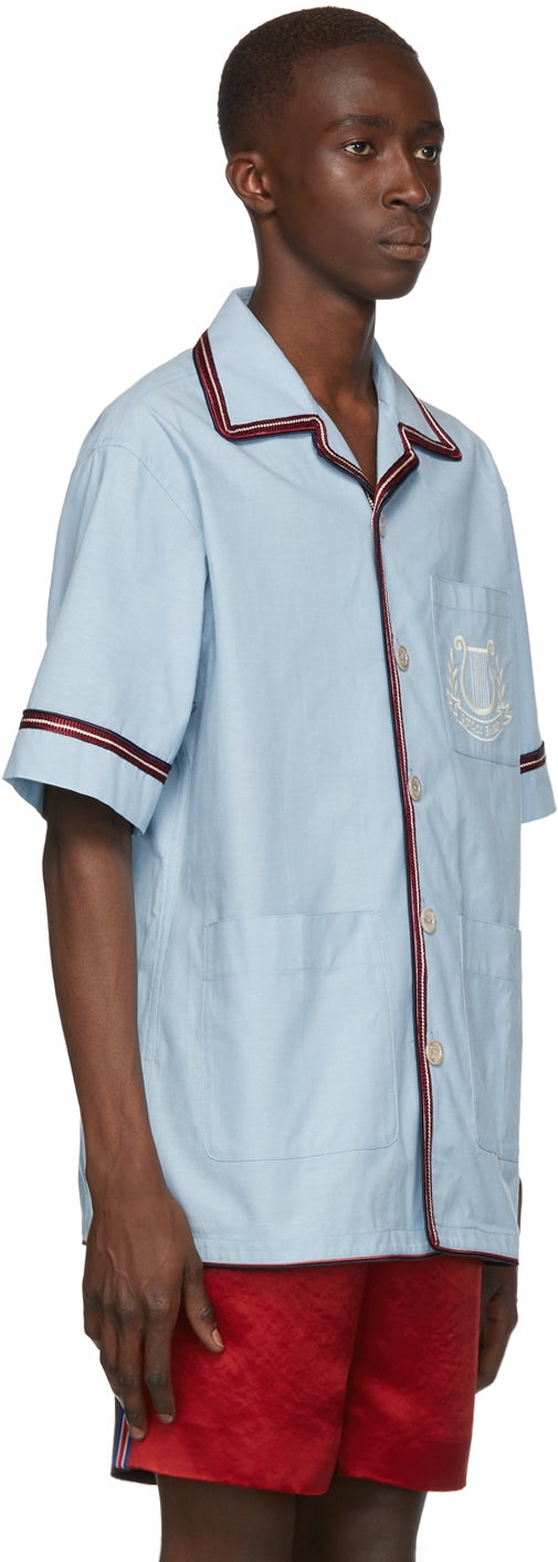 Short sleeve chambray shirt in blue. Braided appliqué in burgundy and white throughout. Open spread collar. Button closure at front. Patch pocket and graphic embroidered in white at chest. Patch pockets at waist. Supplier color: Blue Body: 100% cotton. Trim 1: 100% viscose. Trim 2: 100% acetate. Brand: Gucci