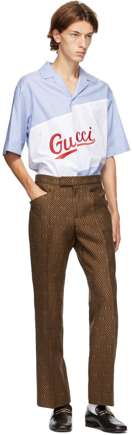 Short sleeve cotton Oxford cloth shirt colorblocked in blue and white. Open spread collar. Button closure and logo embroidered in red at front. Mother-of-pearl hardware. Supplier color: Sky blue Body: 100% cotton. Trim: 100% polyester. Brand: Gucci