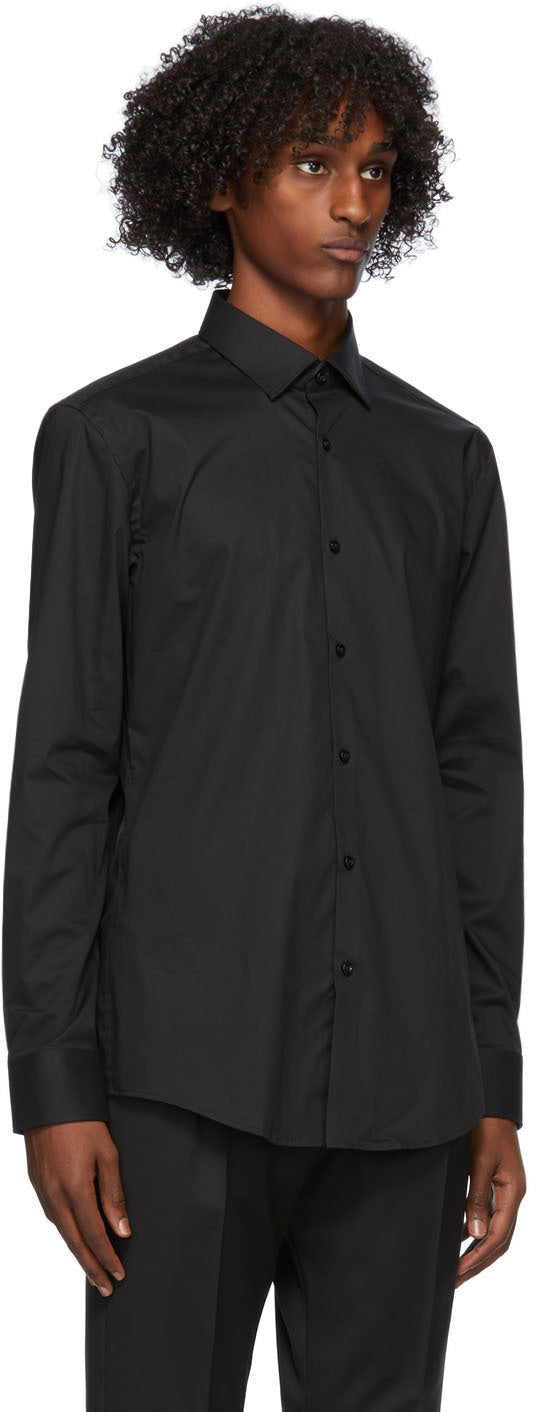 Long sleeve stretch cotton-blend poplin shirt in black. Spread collar. Button closure at front. Adjustable single-button barrel cuffs. Shirttail hem. Darts at back. Tonal hardware. Supplier color: Black 75% cotton, 20% polyamide, 5% elastane. Brand: Hugo