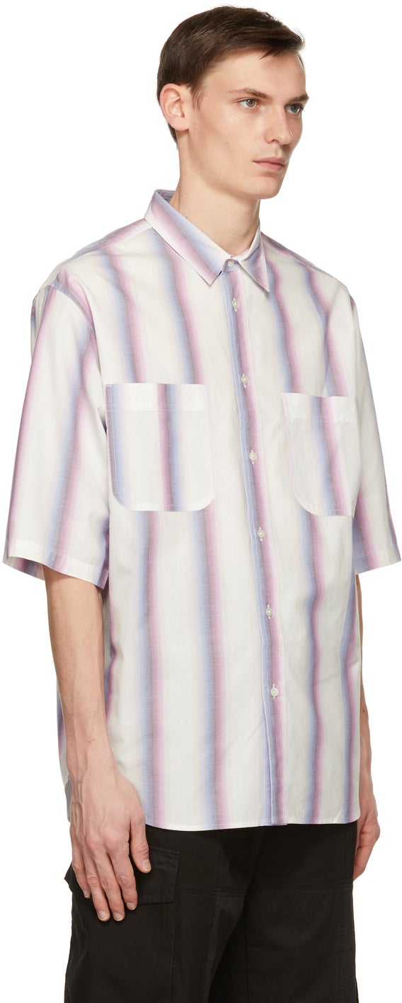 Short sleeve cotton poplin shirt striped in tones of white, pink, and blue. Spread collar. Button closure at front. Patch pockets at chest. Shirttail hem. Supplier color: Pink 100% cotton. Brand: Isabel Marant