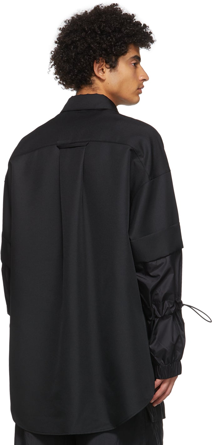 Convertible long sleeve paneled twill and nylon shirt in black. Spread collar. Concealed press-stud closure at front. Patch pocket at chest. Dropped shoulders. Bungee-style drawstring and zippered fastening at detachable sleeves. Adjustable Velcro tab at elasticized cuffs. Locker loop and central box pleat at back. Supplier color: Black Body 1: 100% polyester. Body 2: 100% nylon. Brand: JERIH