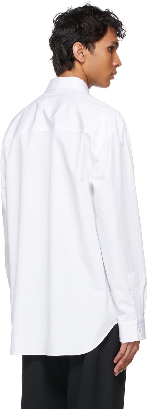 Long sleeve cotton poplin shirt in white. Spread collar. Button closure at front. Logo-embossed hardware in green at chest. Single-button barrel cuffs. Shirttail hem. Mother-of-pearl hardware. Supplier color: White 100% cotton. Brand: Jil Sander