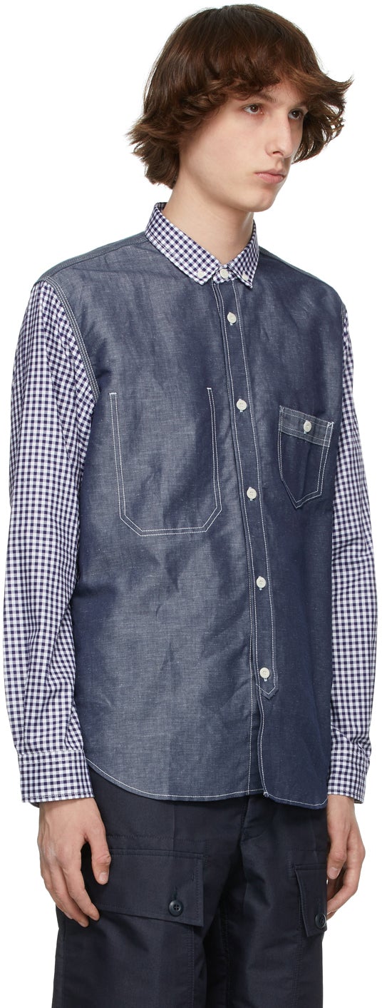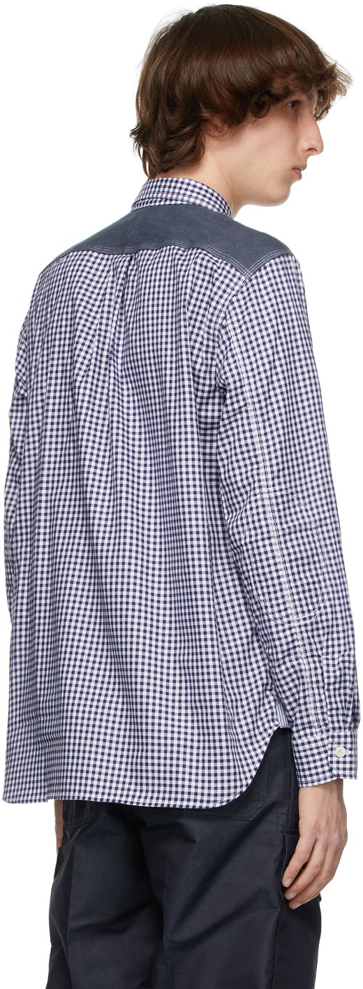 Long sleeve cotton gingham shirt featuring check pattern in white and navy woven throughout. Button-down spread collar. Cotton and linen-blend chambray panel in blue and button closure at front. Patch pocket at chest. Concealed cotton gingham patch featuring striped pattern in white and blue at elbows. Single-button barrel cuffs. Linen twill panel in grey and box pleat at back yoke. Patch pocket at interior. Shirttail hem. Supplier color: White Body 1: 100% cotton. Body 2: 53% cotton, 47% linen. Trim: 100% linen. Brand: Junya Watanabe