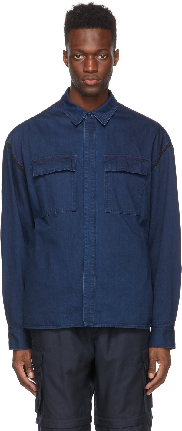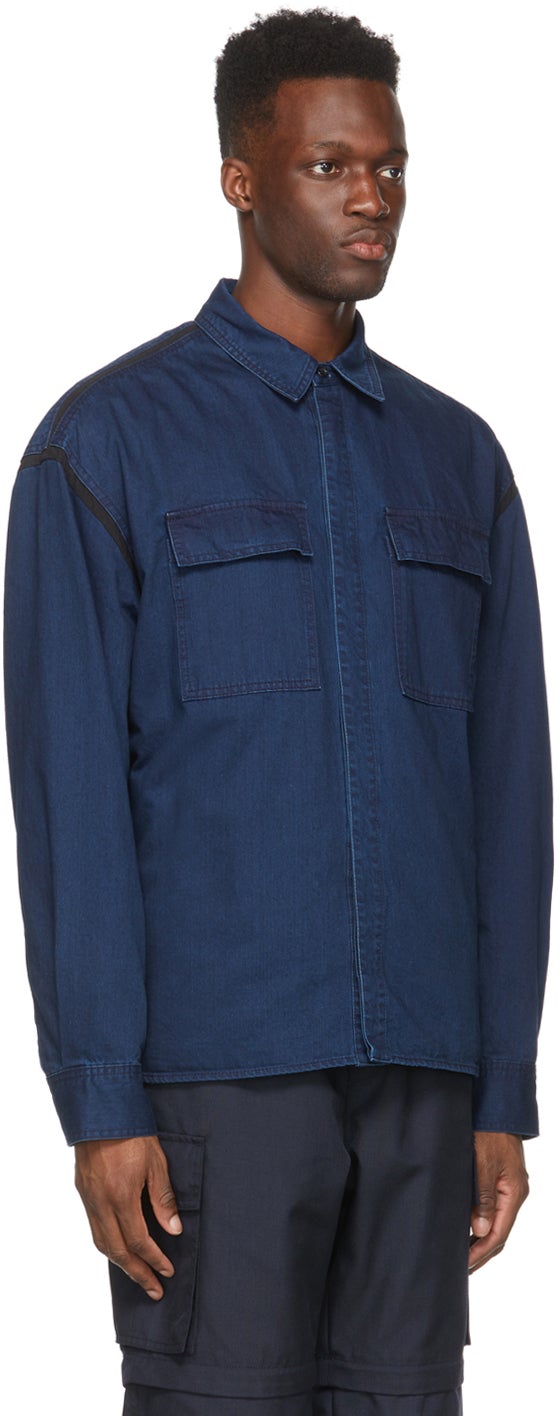 Long sleeve paneled non-stretch denim shirt in blue. Cotton poplin trim in black and fading throughout. Spread collar. Concealed button closure at front. Cotton poplin shirt-style underlay featuring concealed button closure and bungee-style drawstring at hem. Flap pockets at chest. Welt pockets at waist. Single-button barrel cuffs. Central box pleat at back. Black hardware. Supplier color: Blue Body: 100% cotton. Lining: 100% cotton. Brand: Juun.J