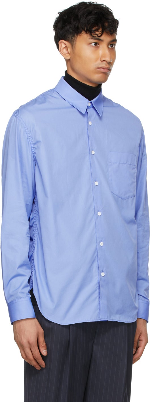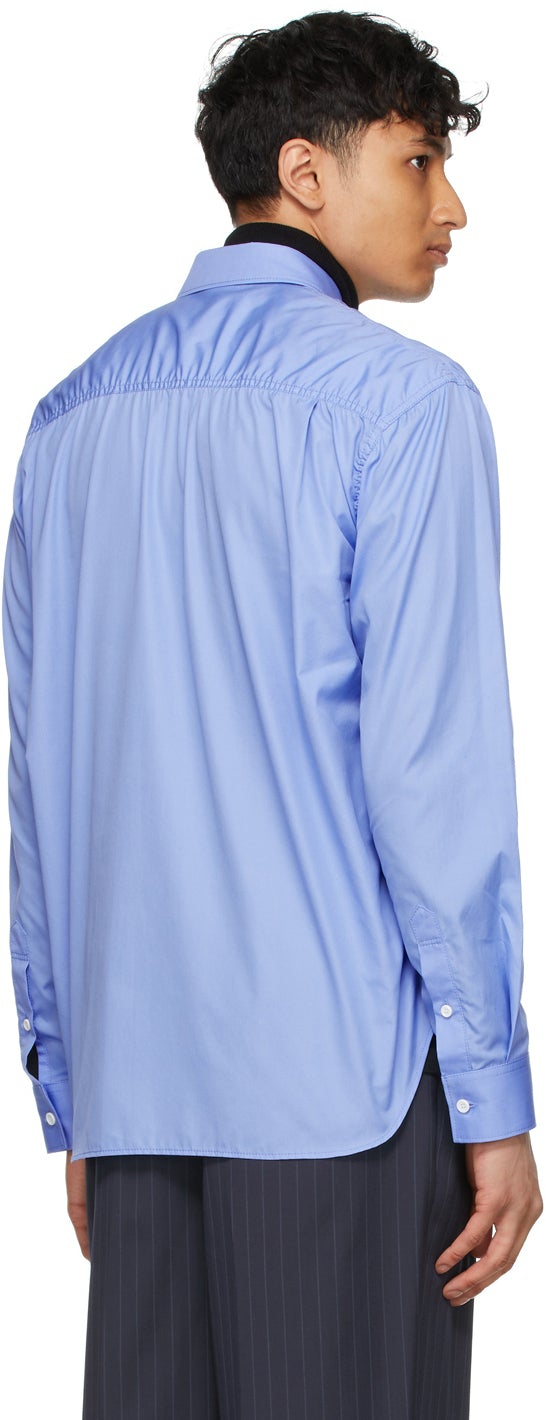 Long sleeve cotton poplin shirt in blue. Layered construction. Spread collar. Button closure at front. Two-button barrel cuffs. Tonal hardware. Supplier color: Blue 100% cotton. Brand: Juun.J