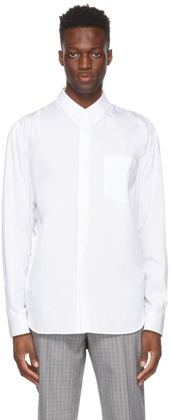 Long sleeve cotton poplin shirt in white. Ruching throughout. Spread collar. Button closure at front. Patch pocket at chest. Single-button barrel cuffs. Shirttail hem. Supplier color: White 100% cotton. Brand: Juun.J