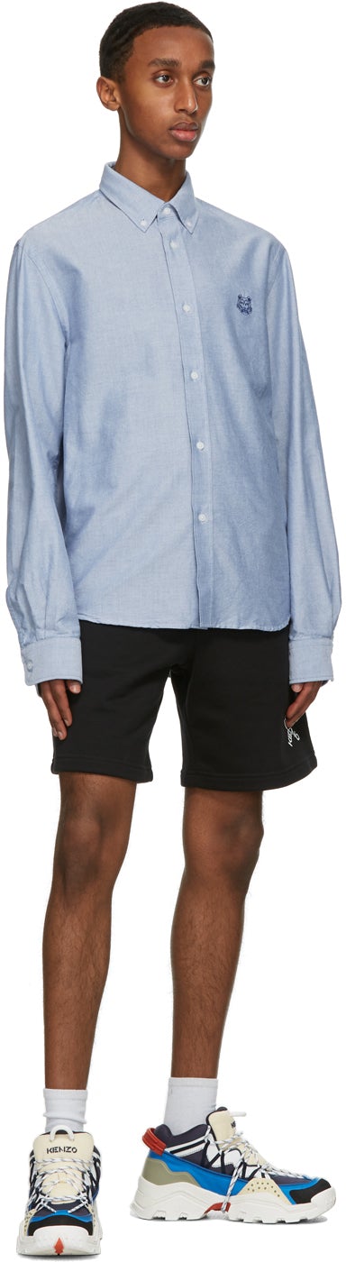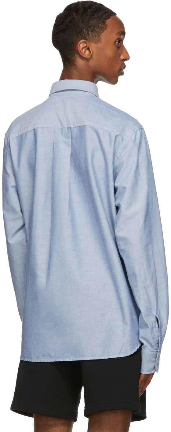Long sleeve cotton Oxford cloth shirt in blue. Button down spread collar. Button closure at front. Embroidered graphic in navy at chest. Single-button barrel cuffs. Central box pleat at back yoke. Shirttail hem. Logo-engraved white hardware. Supplier color: Royal blue 100% cotton. Brand: Kenzo