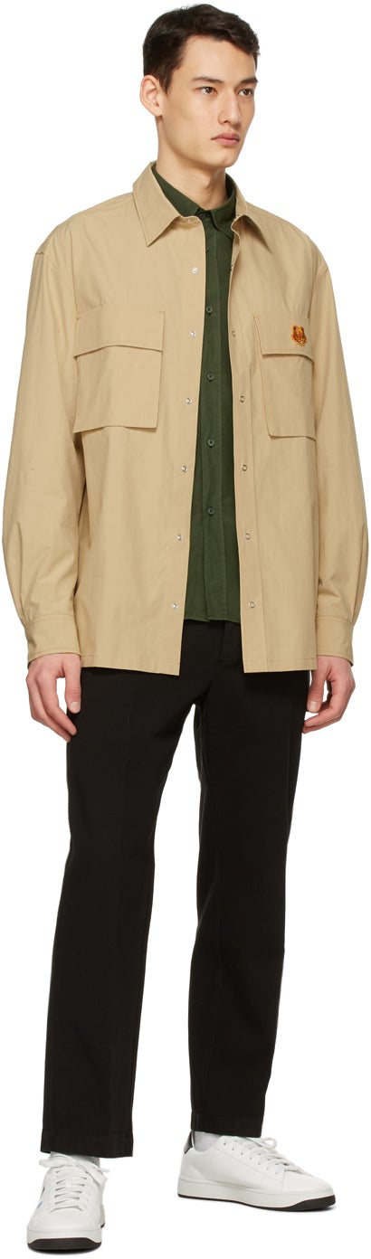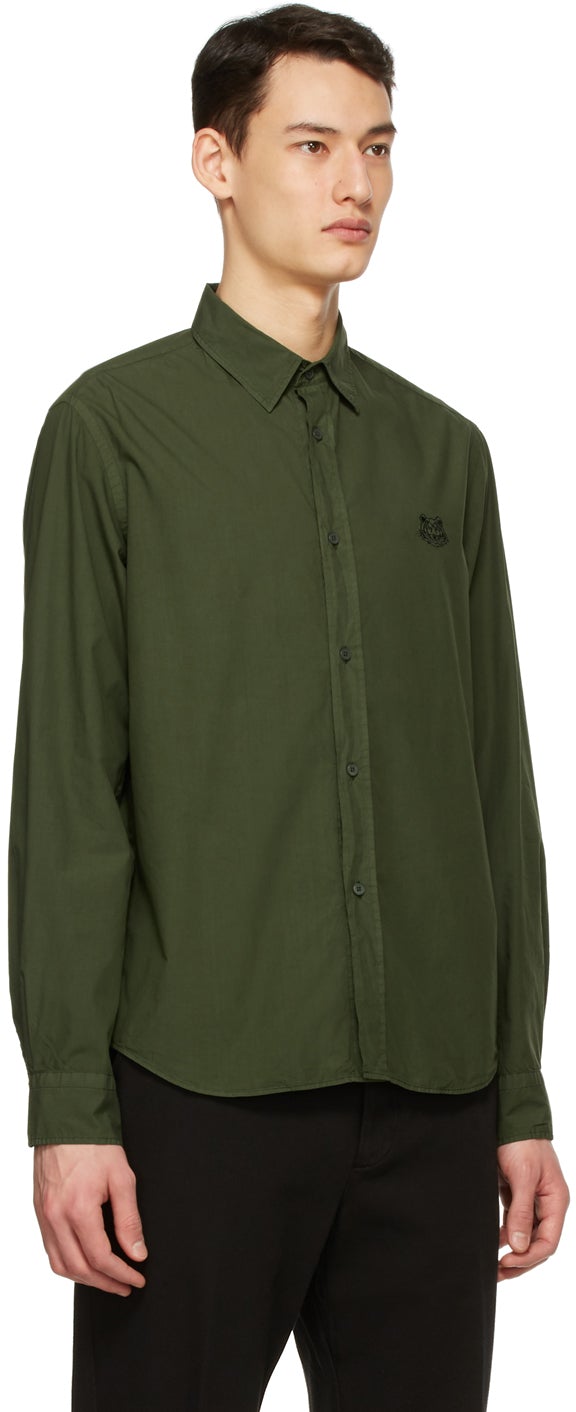 Long sleeve cotton poplin shirt in khaki. Spread collar. Button closure at front. Logo embroidered in black at chest. Single-button barrel cuffs. Shirttail hem. Central box pleat at back. Tonal hardware. Supplier color: Dark khaki 100% cotton. Brand: Kenzo