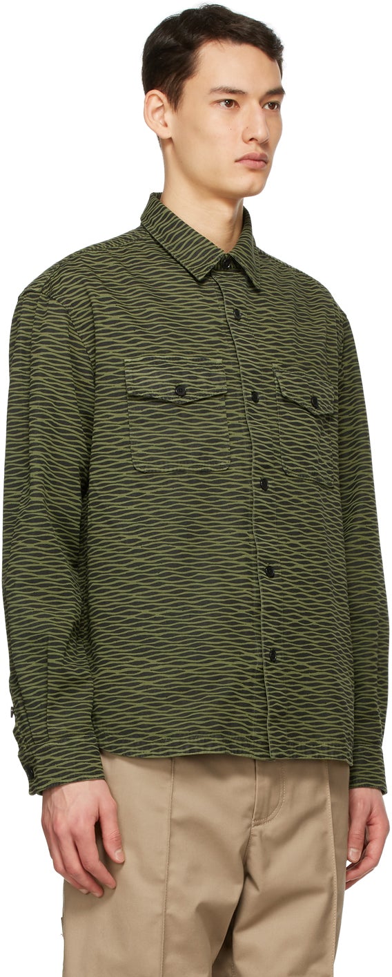 Long sleeve non-stretch denim shirt in khaki featuring graphic pattern printed in black throughout. Spread collar. Button closure at front. Flap pockets at chest. Two-button surgeon's cuffs. Central box pleat at back. Black hardware. Supplier color: Olive 100% cotton. Brand: Kenzo