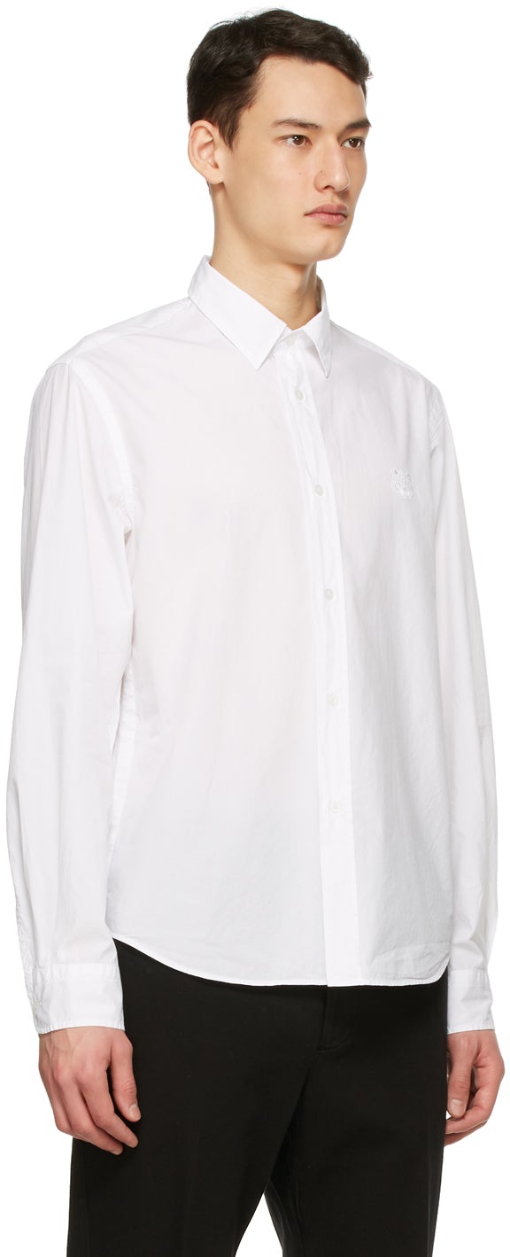 Long sleeve cotton poplin shirt in white. Spread collar. Button closure at front. Tonal logo embroidered at chest. Single-button barrel cuffs. Shirttail hem. Central box pleat at back. Tonal hardware. Supplier color: White 100% cotton. Brand: Kenzo