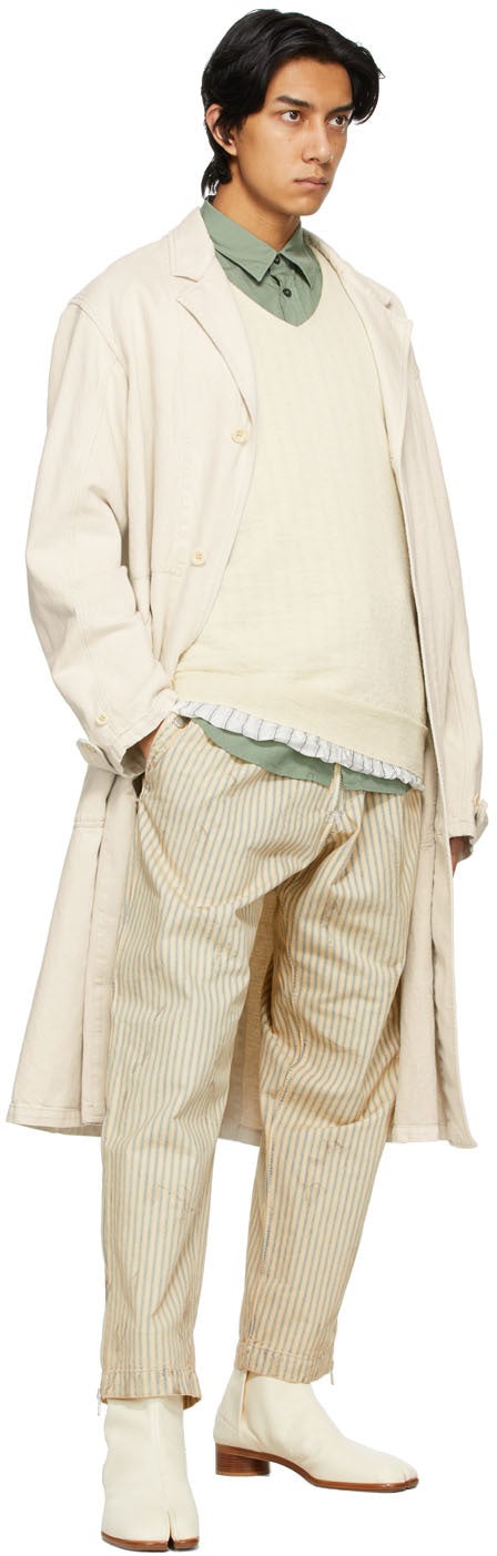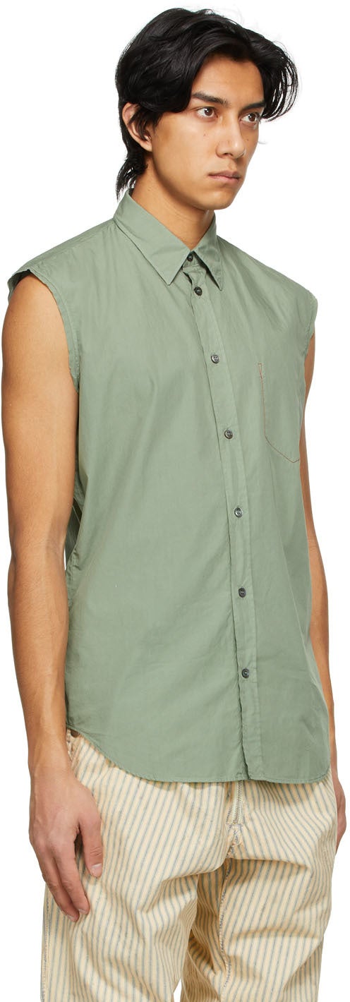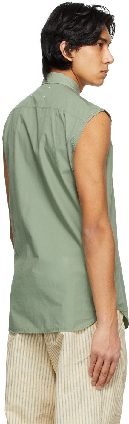 Sleeveless cotton poplin shirt in green. Spread collar. Button closure at front. Topstitching in red at chest. Raw edge at armscyes. Shirttail hem. Signature stitching in white at back. Patch pocket at interior. Mother-of-pearl hardware. Supplier color: Sage 100% cotton. Brand: Maison Margiela