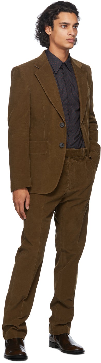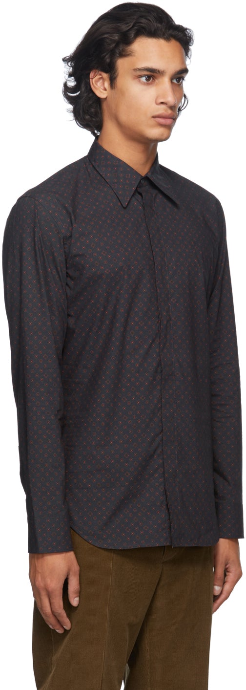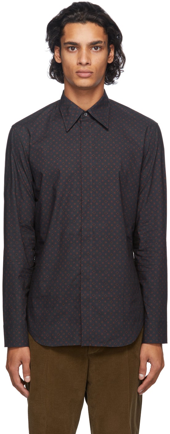 Long sleeve cotton poplin shirt in navy featuring graphic pattern in tones of brown and red. Spread collar. Concealed button closure at front. Single-button barrel cuffs. Signature white stitching at back collar. Shirttail hem. Mother-of-pearl hardware. Supplier color: Navy 100% cotton. Brand: Maison Margiela