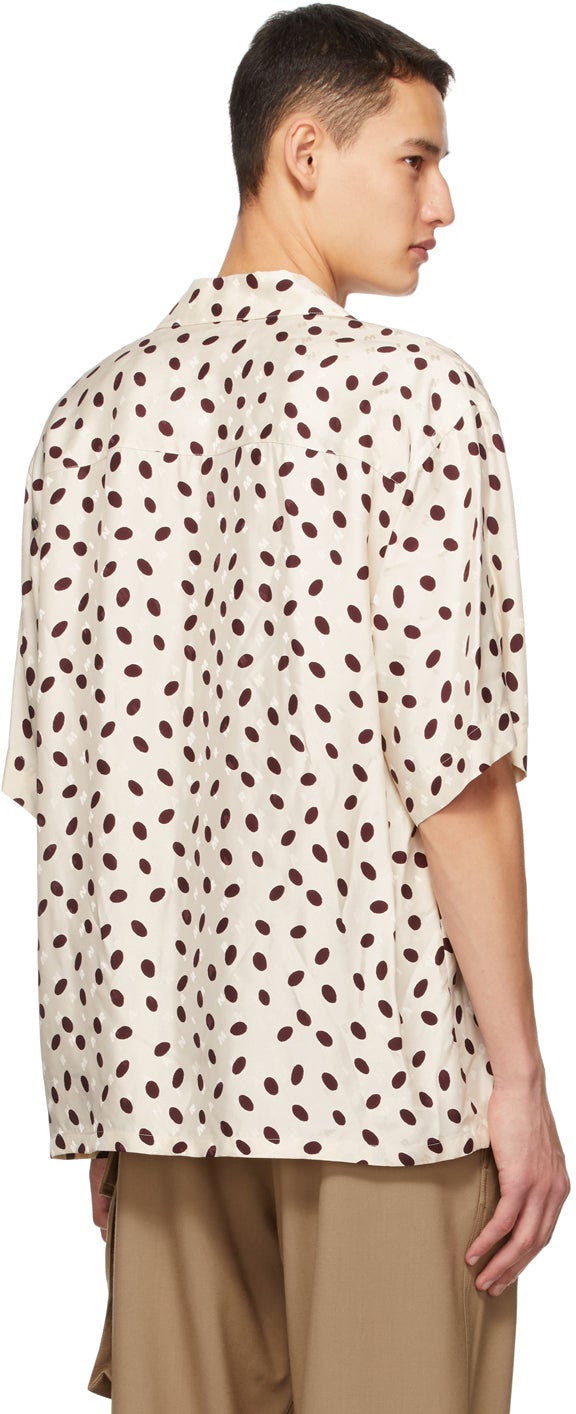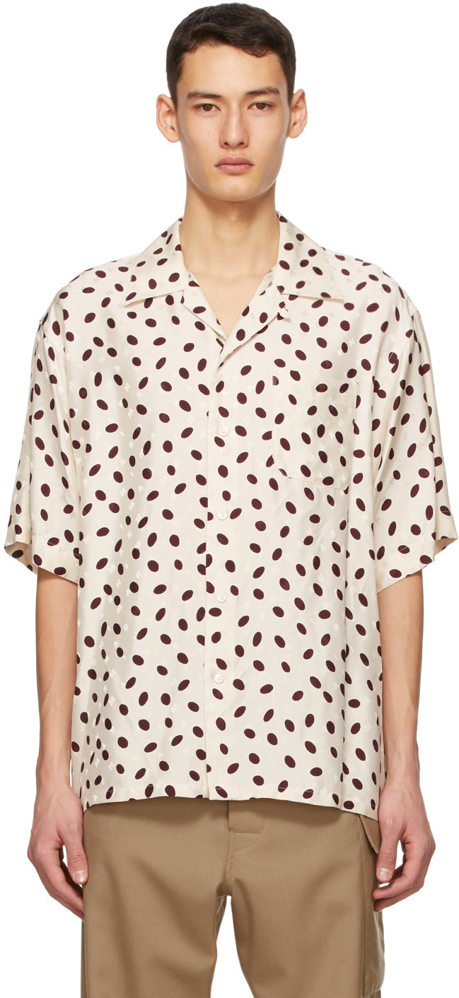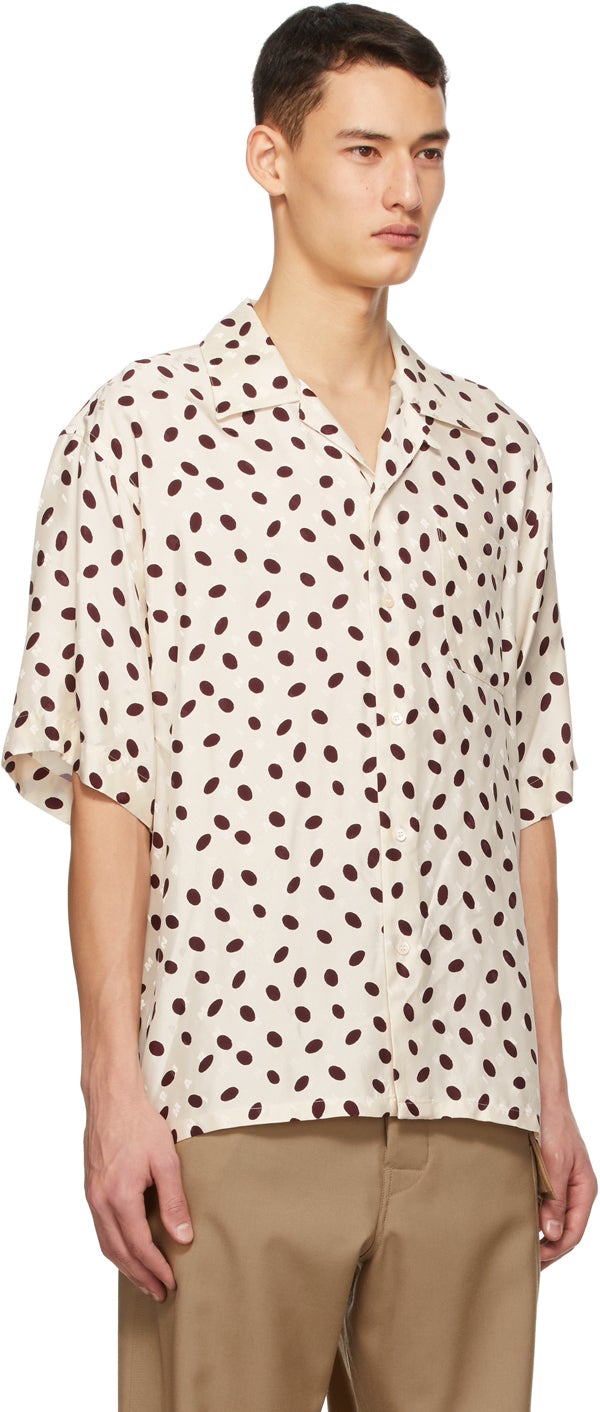 Short sleeve jersey shirt in beige. Logo and graphic pattern in brown and beige throughout. Open spread collar. Patch pocket at chest. Tonal mother-of-pearl hardware. Supplier color: Ivory Body: 100% viscose. Lining: 70% cotton, 30% nylon. Brand: Marni