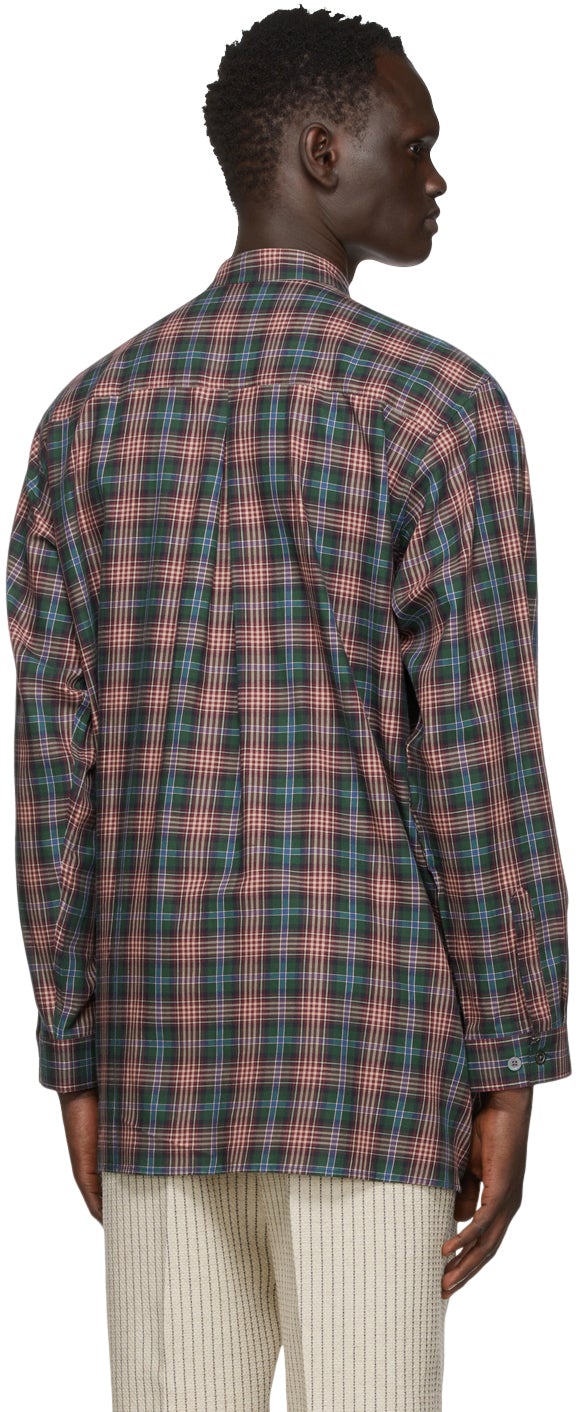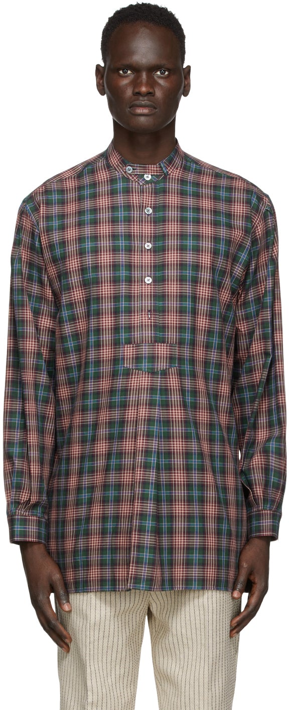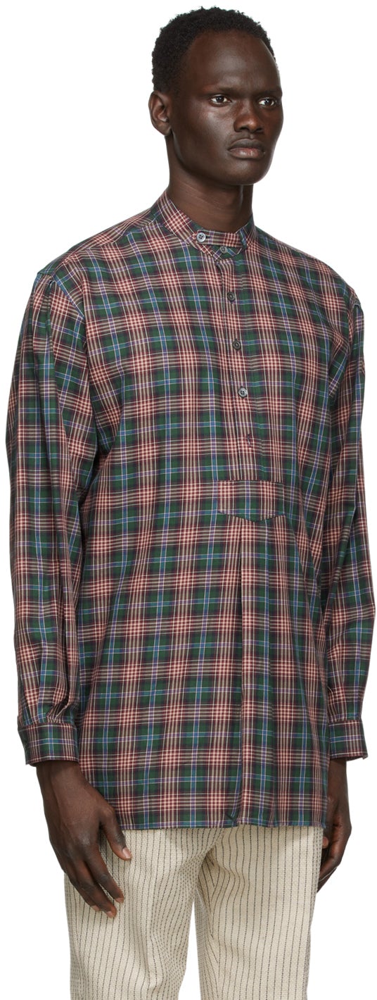 Long sleeve cotton twill shirt featuring check pattern in multicolor. Band collar featuring throat guard with button fastening. Half-button closure and box pleat at front. Pleats at sleeves. Adjustable two-button barrel cuffs. Inverted box pleat at back yoke. Supplier color: Dark green 100% cotton. Brand: Martin Asbjørn