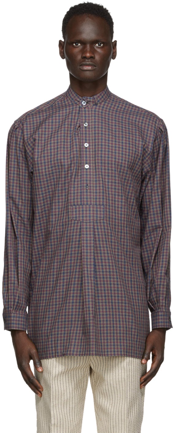 Long sleeve cotton twill shirt featuring check pattern in tones of purple, blue, and beige. Band collar featuring throat guard with button fastening. Half-button closure and box pleat at front. Pleats at sleeves. Adjustable two-button barrel cuffs. Inverted box pleat at back yoke. Supplier color: Purple 100% cotton. Brand: Martin Asbjørn