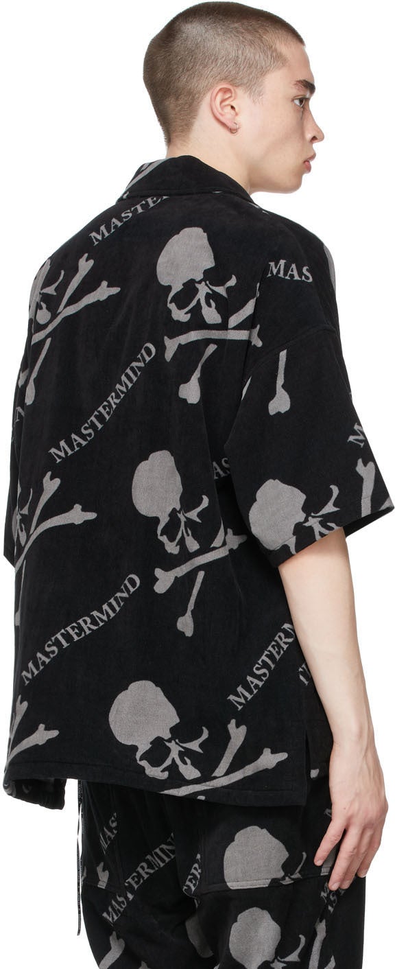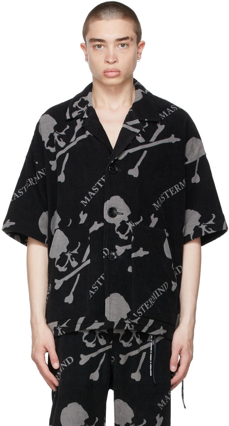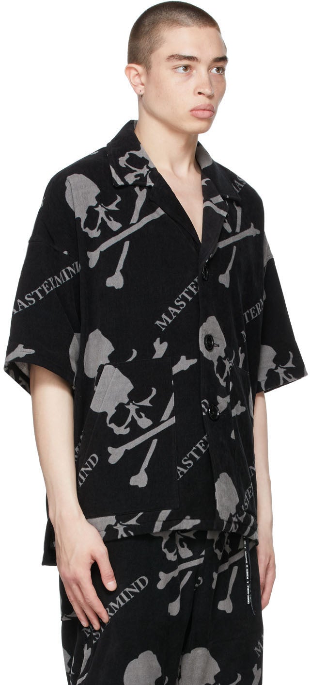 Short sleeve cotton terrycloth shirt in black. Logo pattern in grey throughout. Open spread collar. Button closure at front. Patch pockets at waist. Vented side-seams. Extended leather trim featuring logo pattern printed in white at inner hem. Supplier color: Black 100% cotton. Brand: mastermind WORLD