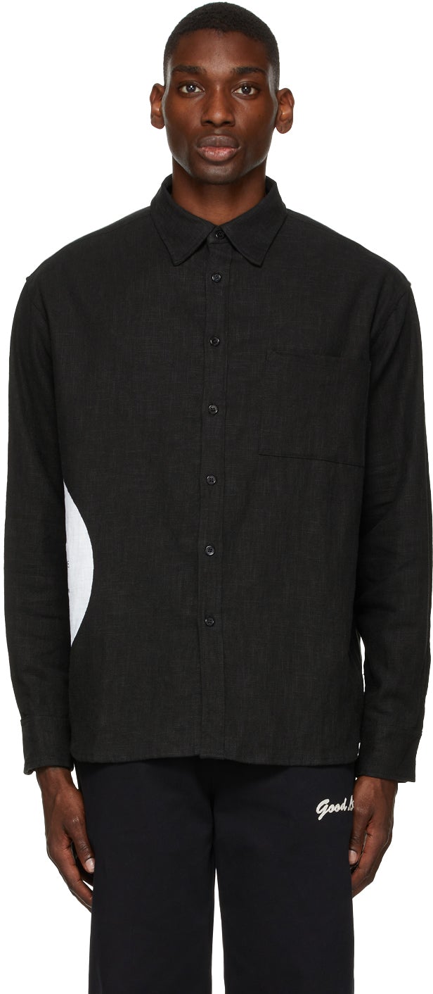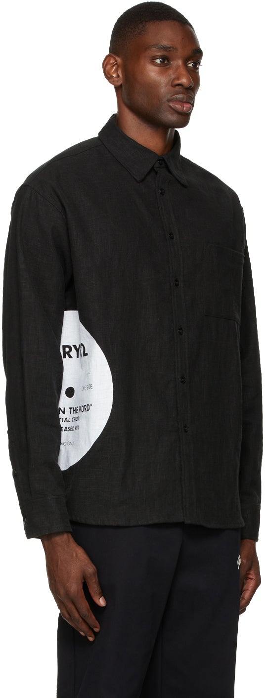 Long sleeve plain-woven linen shirt in black. Spread collar. Button closure at front. Patch pocket at chest. Graphic printed in white at front and back. Single-button barrel cuffs. Tonal hardware. Supplier color: Black 100% linen. Brand: Mr. Saturday