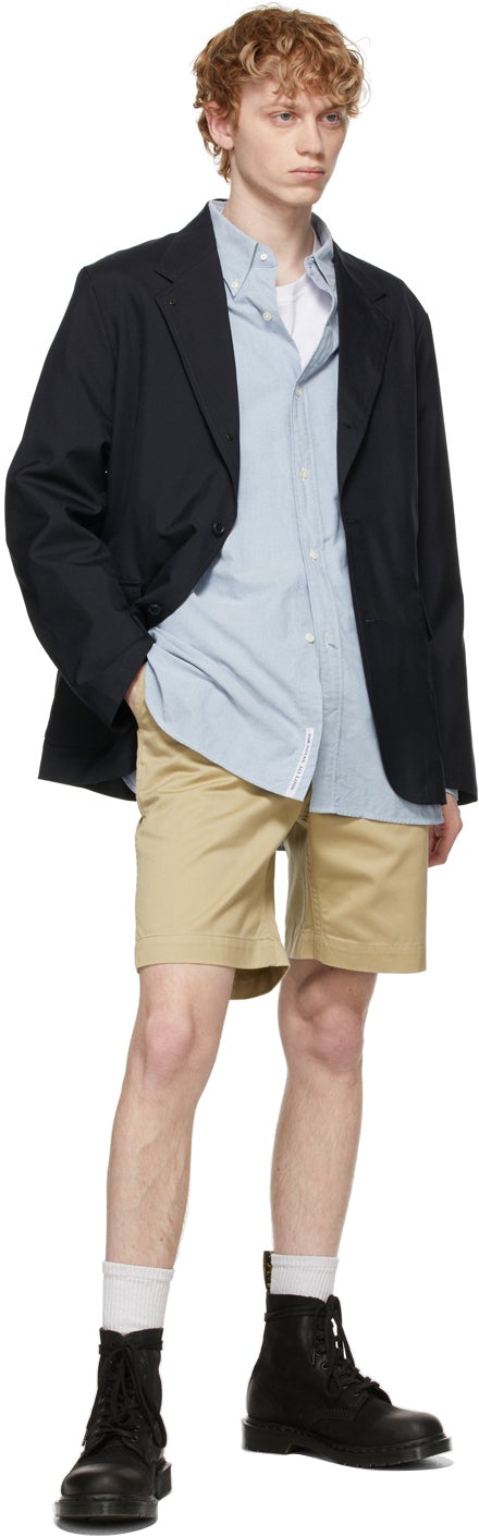 Long sleeve plain-woven nylon and cotton-blend shirt in blue. Spread collar. Button closure and logo embroidered in navy at front. Patch pocket at chest. Single-button barrel cuffs. Mother-of-pearl hardware. Contrast stitching in white. Supplier color: Blue 55% nylon, 45% cotton. Brand: Nanamica