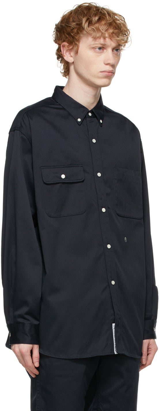 Long sleeve cotton-blend canvas shirt in navy. Spread collar. Button closure and embroidered logo in white at front. Patch pocket and flap pocket at chest. Single-button barrel cuffs. White hardware. Supplier color: Navy 65% cotton, 35% polyester. Brand: Nanamica