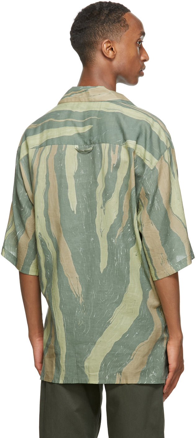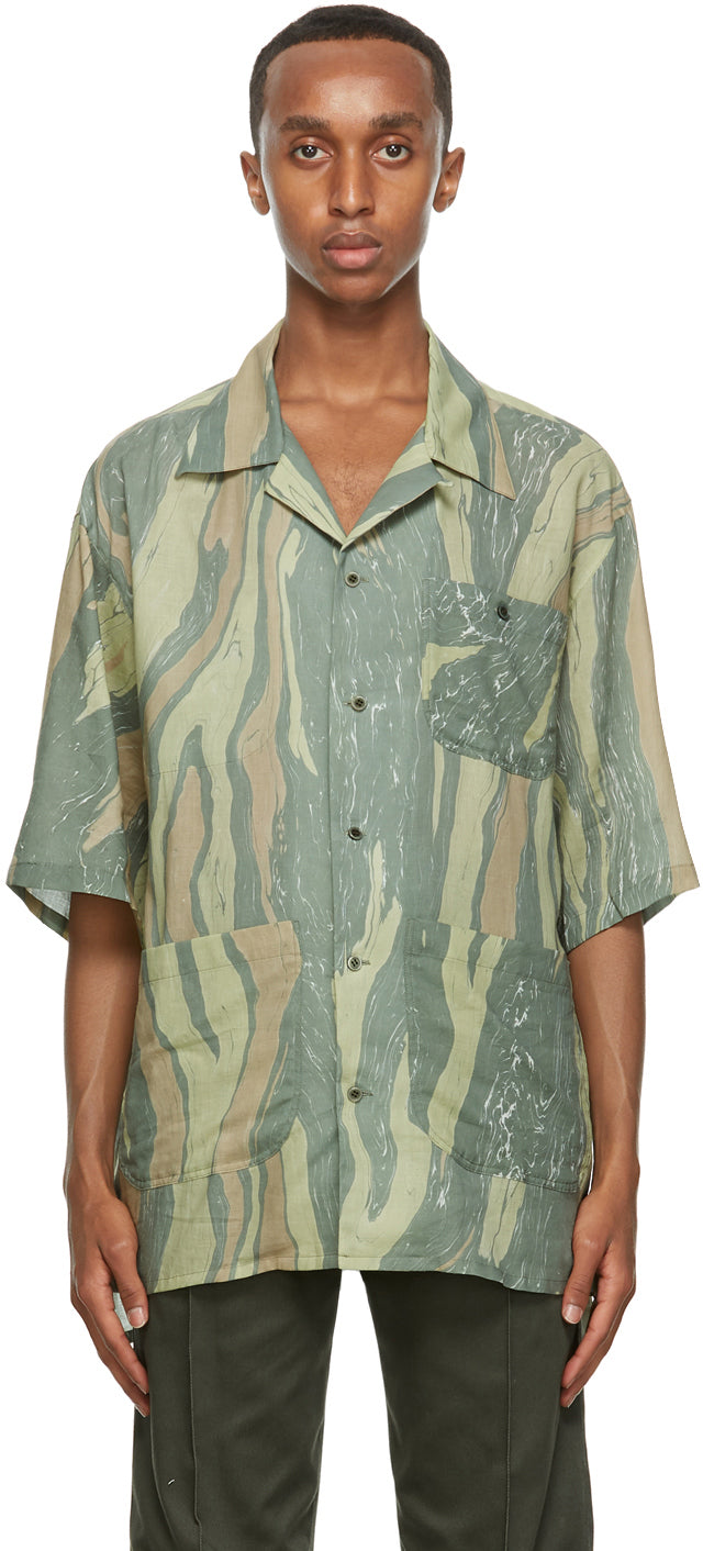 Short sleeve cotton and wool-blend shirt featuring graphic pattern in tones of green and tan throughout. Concealed button closure at spread collar. Button closure, patch pockets, and shadow pocket at front. Vents at side-seams. Locker loop at back collar. Central box pleat at back. Shirttail hem. Supplier color: Green 87% cotton, 13% wool. Brand: Nicholas Daley