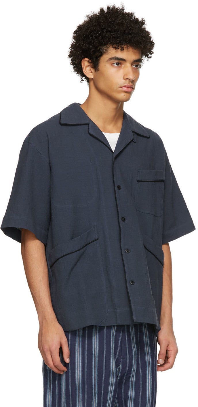 Short sleeve slub cotton shirt in navy. Piping in black throughout. Open spread collar. Button closure at front. Patch pockets at chest and waist. Patch pocket at interior. Supplier color: Navy 100% cotton. Brand: Nicholas Daley