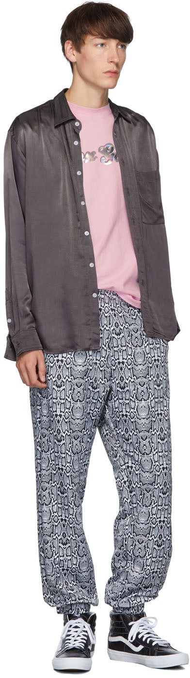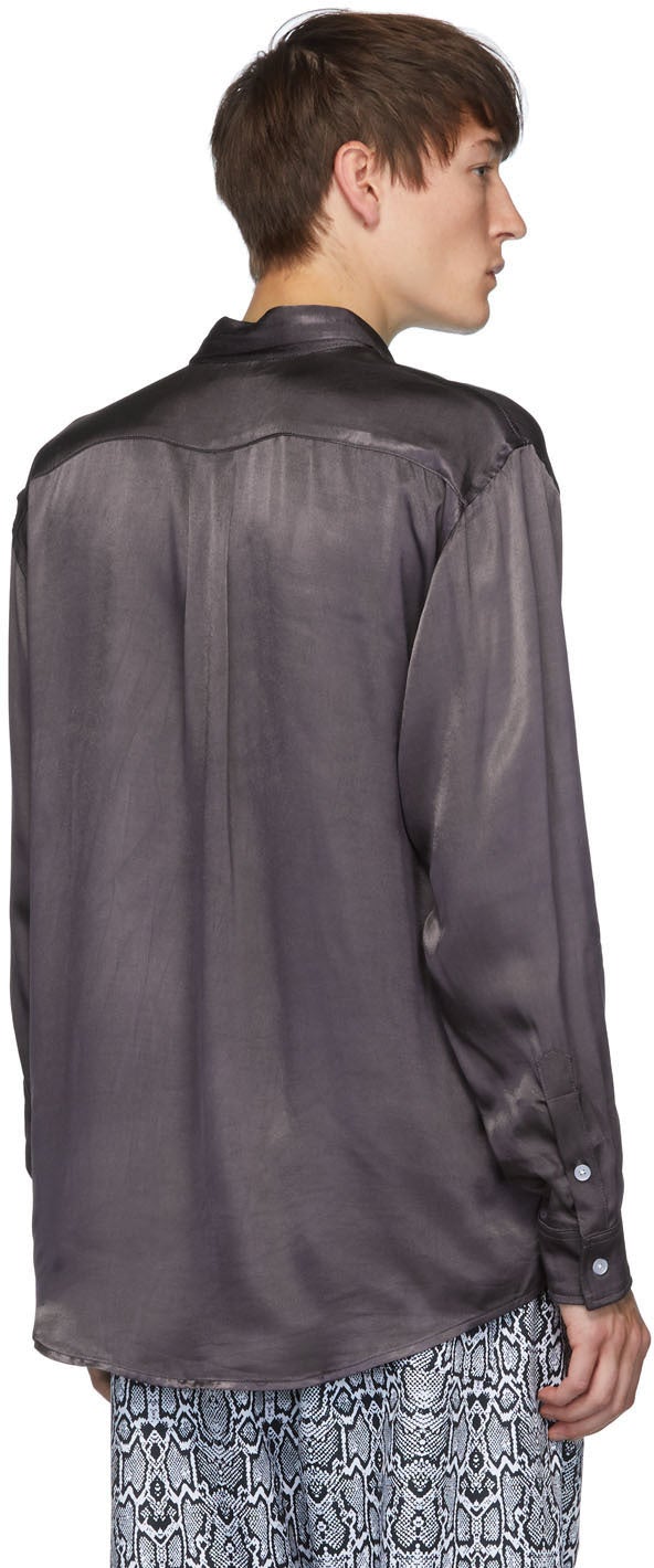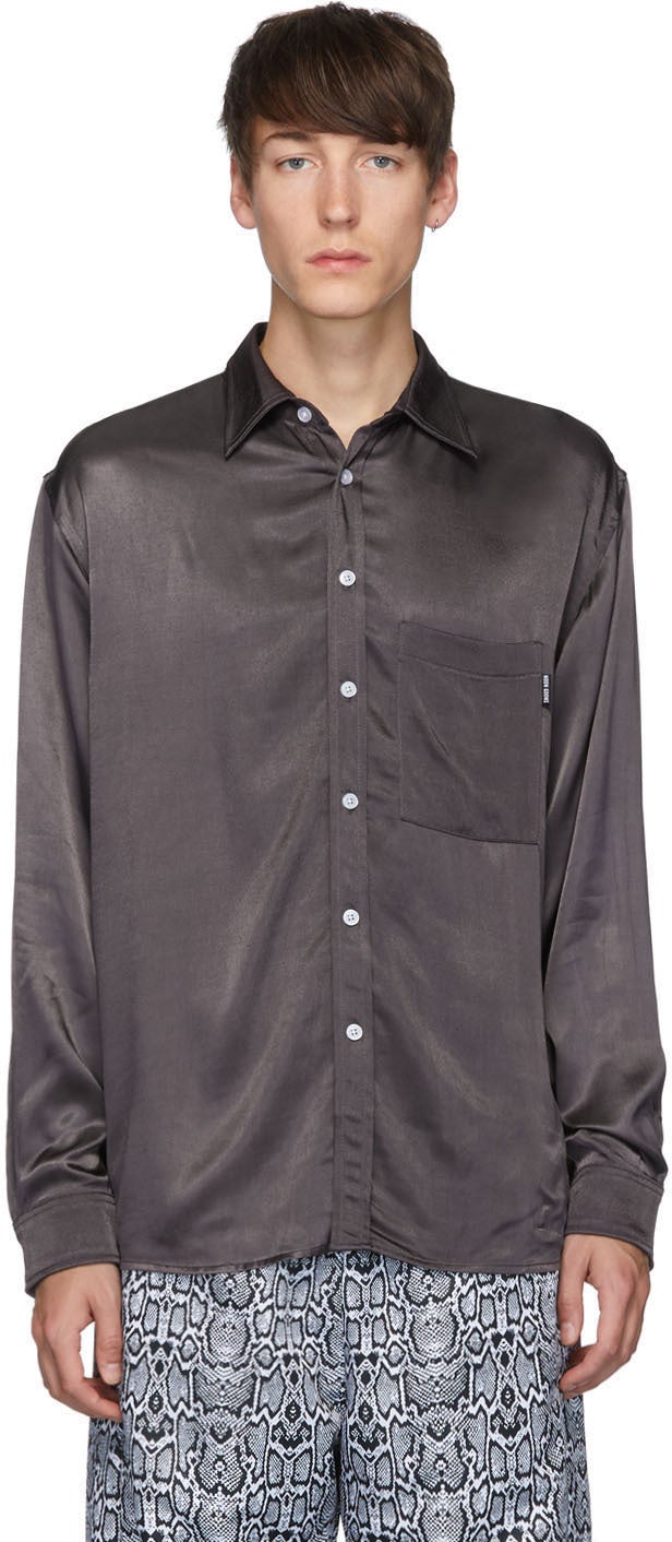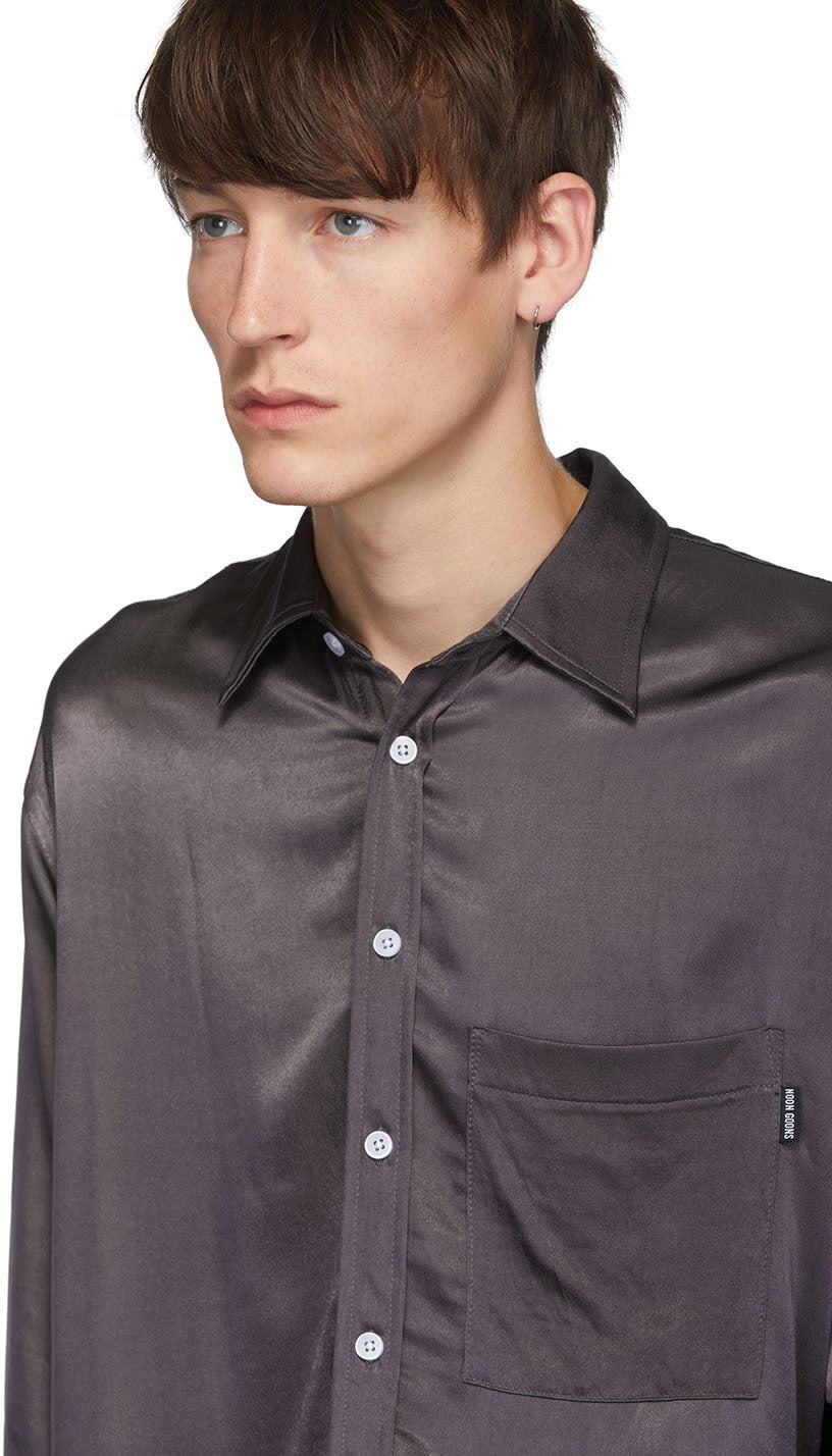 Long sleeve satin shirt in grey. Spread collar. Button closure at front. Patch pocket and logo flag at chest. Single-button barrel cuffs. Box pleat at back. Shirttail hem. Supplier color: Vintage black 100% rayon. Brand: Noon Goons