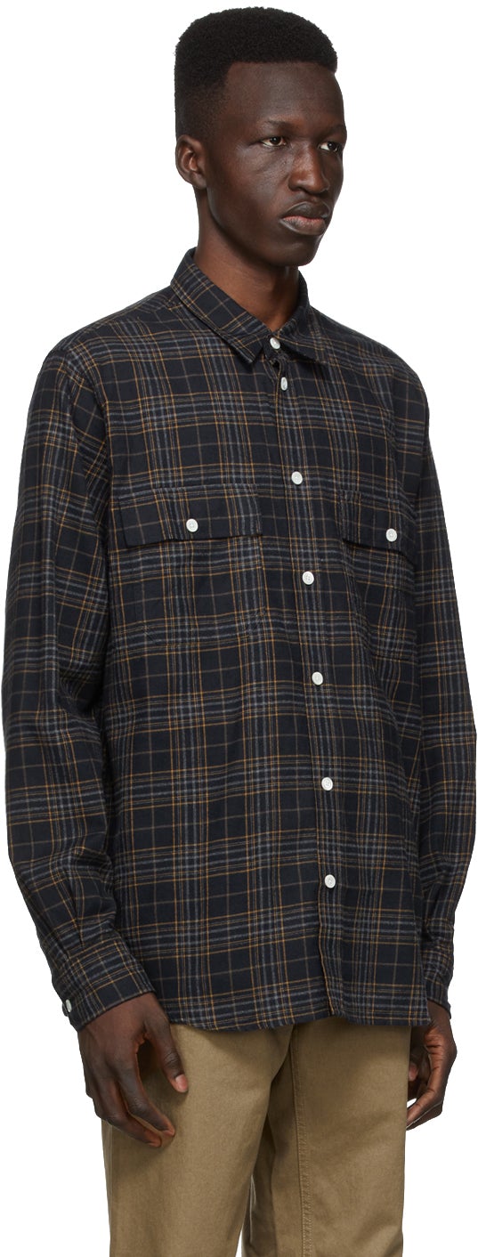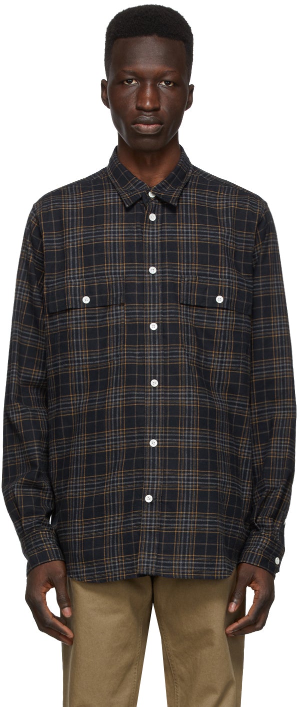 Long sleeve cotton flannel shirt in navy featuring check pattern in grey and yellow. Spread collar. Button closure at front. Flap pockets at chest. Single-button barrel cuffs. Shirttail hem. Locker loop at back. White mother-of-pearl hardware. Supplier color: Dark navy 100% cotton. Brand: Norse Projects