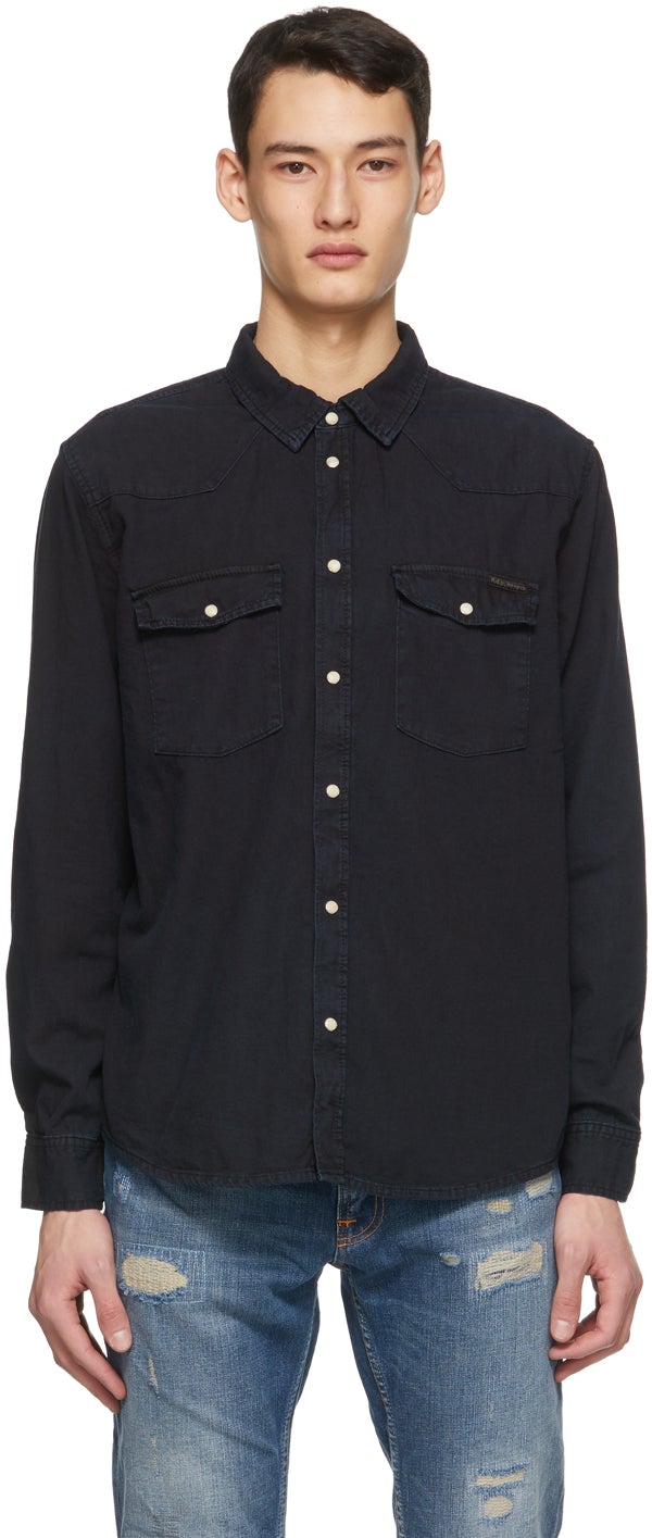 Long sleeve 6 oz. non-stretch organic cotton denim shirt in black. Spread collar. Press-stud closure at front. Flap pockets and textile logo patch at chest. Two-press-stud barrel cuffs. Shirttail hem. Supplier color: Black 100% cotton. Brand: Nudie Jeans