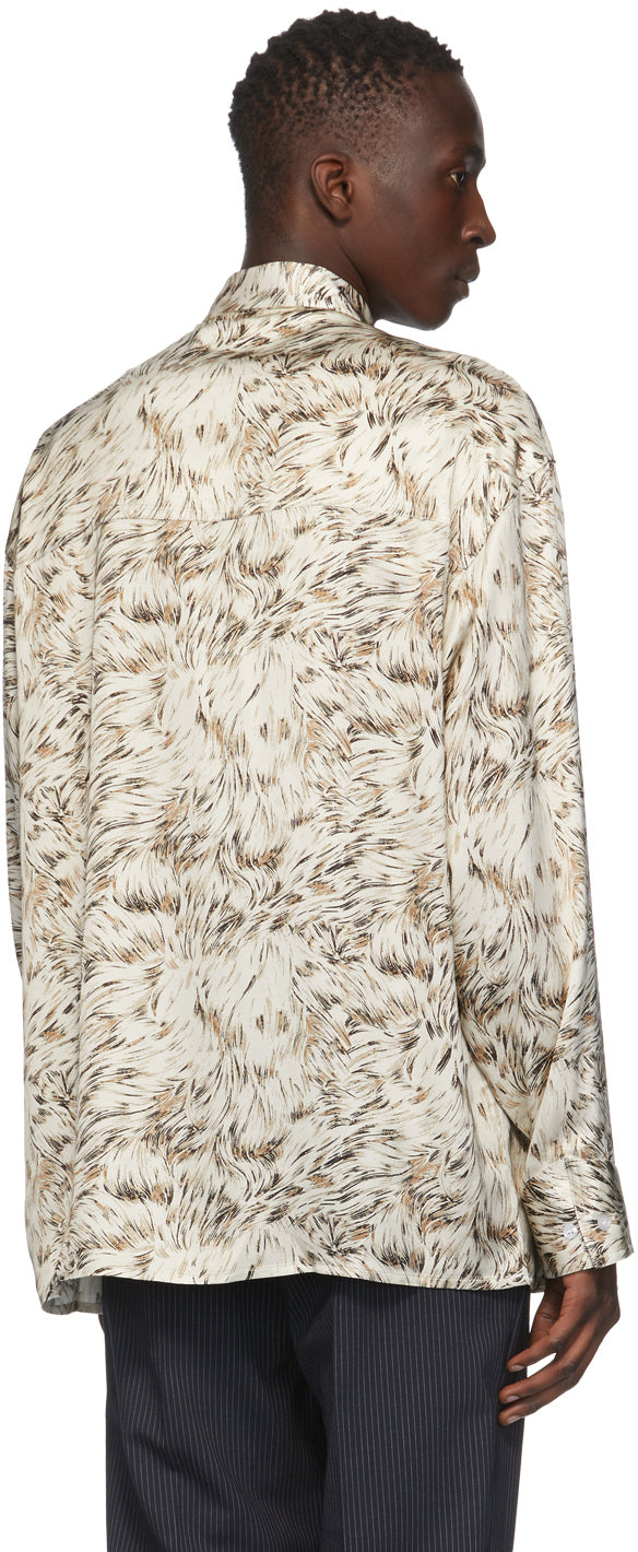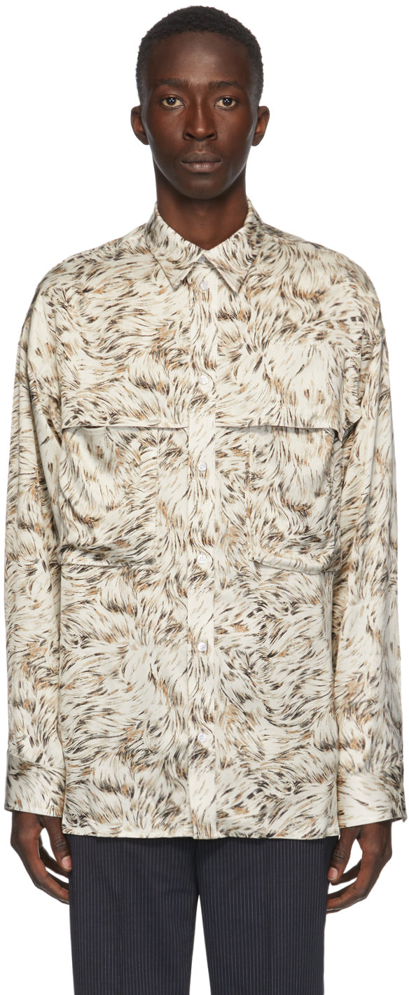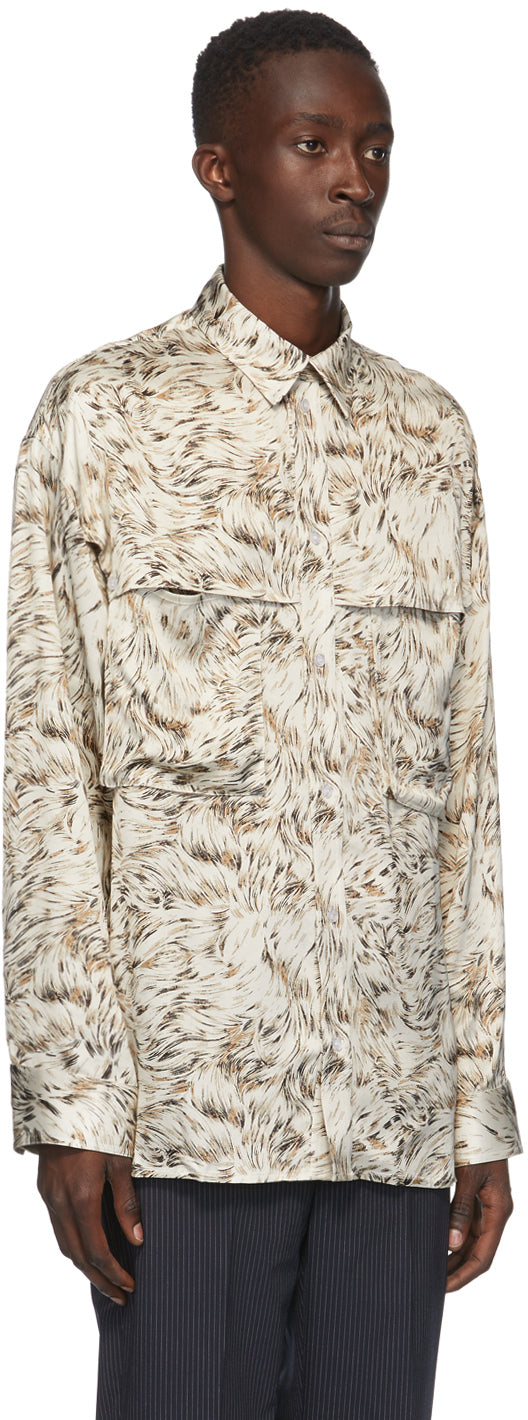 Long sleeve viscose satin shirt in beige featuring graphic pattern printed in black and brown throughout. Spread collar. Patch pockets at front. Single-button barrel cuffs. Shirttail hem. Mother-of-pearl hardware. Supplier color: Pristine fur 100% viscose. Brand: Opening Ceremony