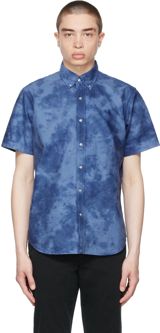 Short sleeve cotton Oxford cloth shirt featuring tie-dye pattern in tones of blue. Spread collar. Button closure at front. Tonal logo embroidered at chest. Central box pleat at back. Shirttail hem. Supplier color: Earth blue/White 100% cotton. Brand: Polo Ralph Lauren