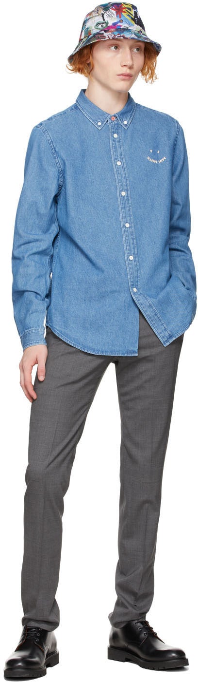 Long sleeve non-stretch denim shirt in blue. Fading throughout. Spread collar. Button closure at front. Logo embroidered in white at chest. Textile logo flag in white at side-seam. Single-button barrel cuffs. Pink and mother-of-pearl hardware. Supplier color: Medium wash 100% cotton. Brand: PS by Paul Smith