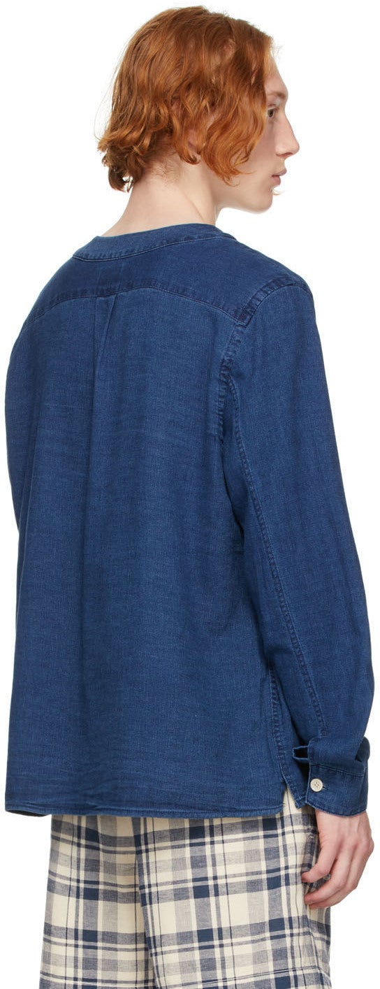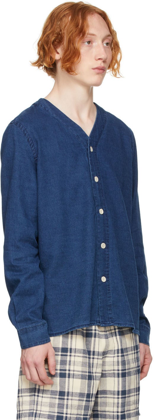 Long sleeve non-stretch cotton denim shirt in blue. V-neck collar. Button-down closure at front. Single-button barrel cuffs. Shirttail hem. Supplier color: Dark wash 100% cotton. Brand: PS by Paul Smith