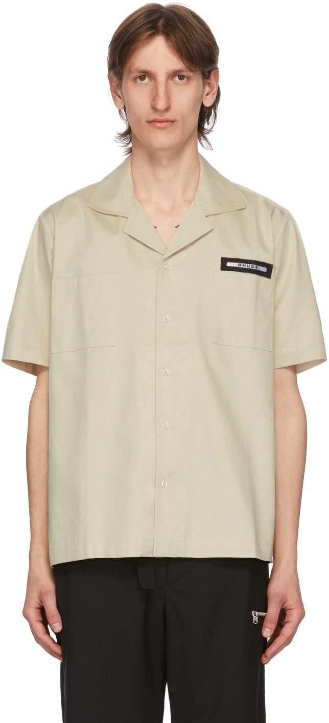 Short sleeve cotton shirt in off-white. Open spread collar. Button closure at front. Patch pockets and logo patch in black and white at chest. Vented side-seams. Panelled back colorblocked in off-white, black, and red. Supplier color: White 100% cotton. Brand: Rhude
