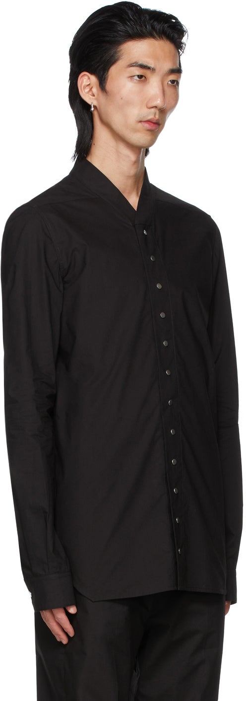 Long sleeve cotton poplin shirt in black. Y-neck collar. Press-stud closure at front. Single-button barrel cuffs. Silver-tone hardware. Supplier color: Black 100% cotton. Brand: Rick Owens