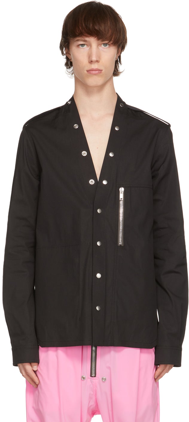 Long sleeve stretch organic cotton poplin shirt in black. V-neck collar. Press-stud closure at front extends to collar. Zippered pocket at chest. Single-press-stud barrel cuffs. Drop-tail hem. Silver-tone hardware. Supplier color: Black 97% organic cotton, 3% elastane. Brand: Rick Owens