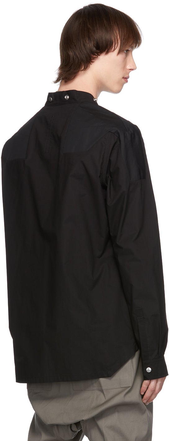 Long sleeve cotton poplin shirt in black. Y-neck collar. Press-stud button closure at front and cuffs. Zippered pocket at chest. Shirttail hem. Silver-tone hardware. Supplier color: Black Body: 100% cotton. Trim: 97% cotton, 3% elastane. Brand: Rick Owens