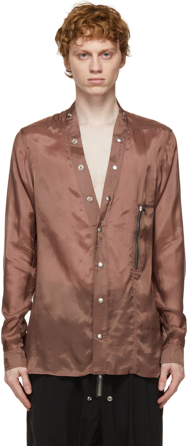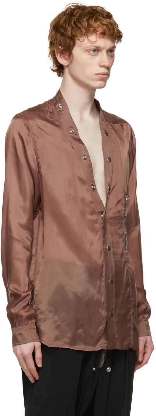 Long sleeve cupro satin shirt in brown. V-neck collar. Press-stud closure at front extends to collar. Zippered pocket at chest. Single-press-stud barrel cuffs. Drop-tail hem. Silver-tone hardware. Supplier color: Throat 100% cupro. Brand: Rick Owens