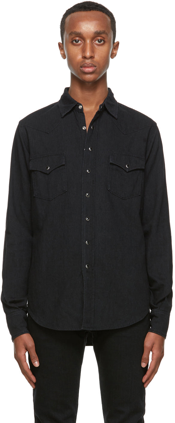 Long sleeve denim shirt in black. Fading throughout. Spread collar. Press-stud closure at front. Flap pockets at chest. Rounded hem. Four-button barrel cuffs. Silver-tone hardware. Supplier color: Black stonewash 100% cotton. Brand: Saint Laurent